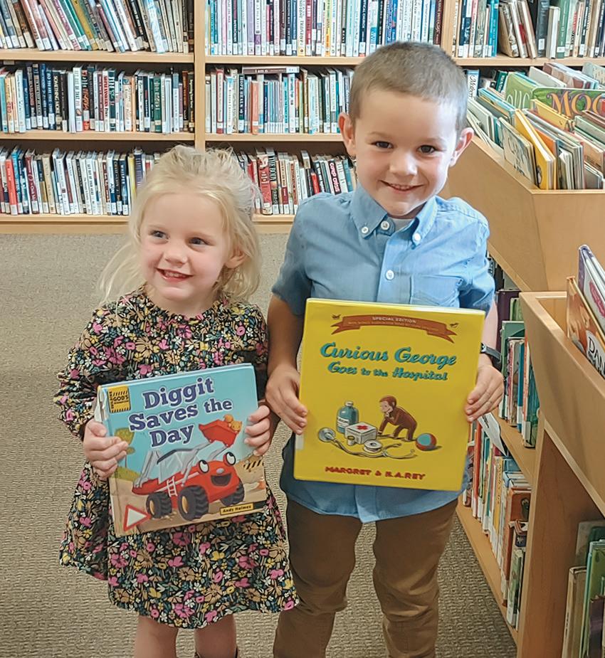 Anna (left) and Joel Augsburger pick out picture books at the church library.
