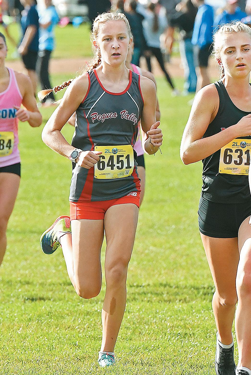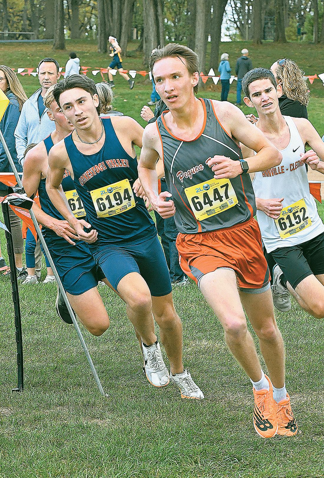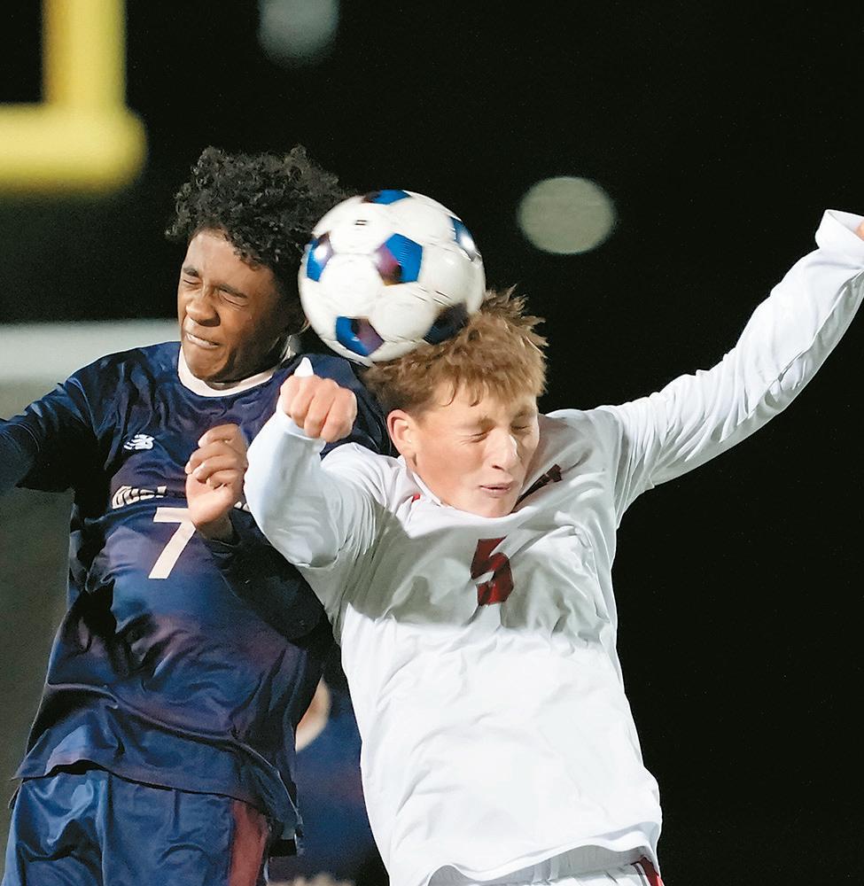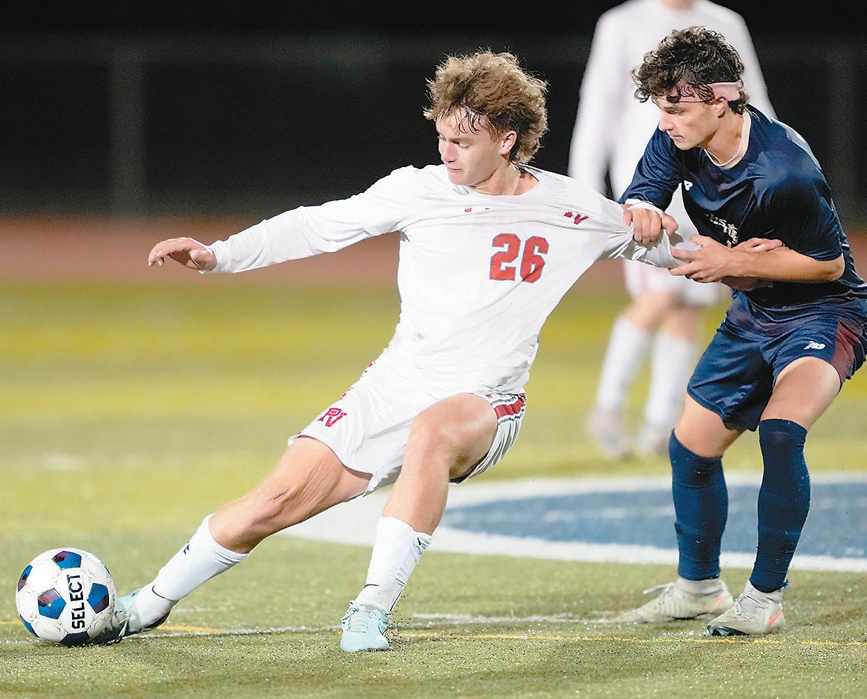 Pequea Valley’s Hayden Weaver tries to reach for the ball while Conestoga Valley’s Paxton Rossos holds him back in a 1-0 shutout win during the Lancaster-Lebanon League quarterfinals at CV on Thursday, October 9.