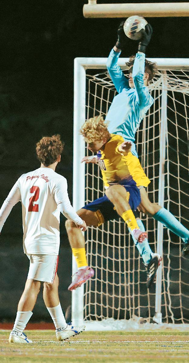Under the lights, Braves’ Logan Bradley makes one of his 14 saves against Lancaster Catholic in a 2-0 loss during the District Three quarterfinals on Saturday, October 25 in Lancaster.