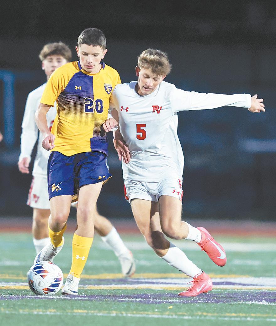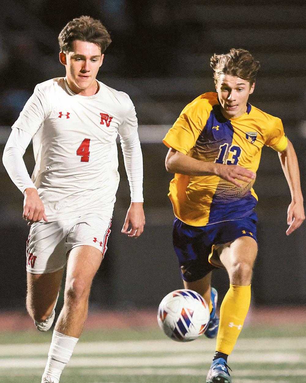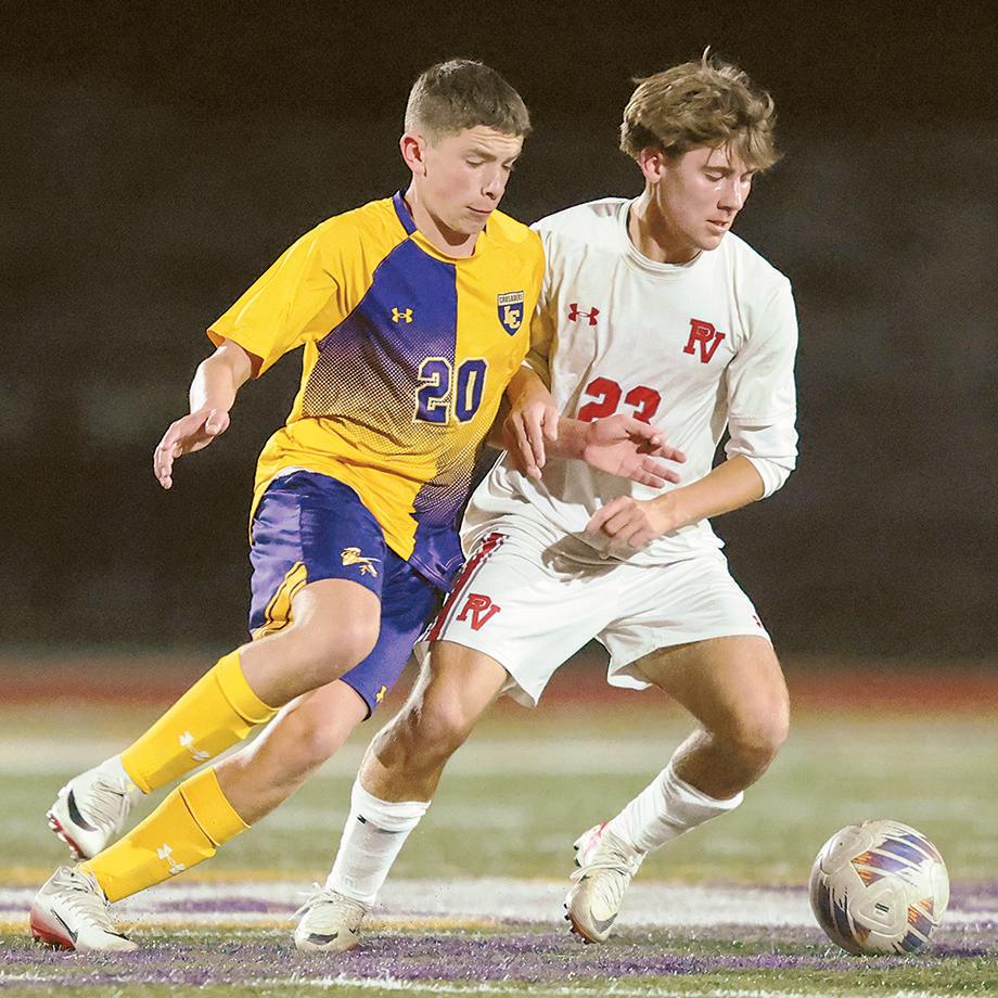 On Saturday, October 25, PV’s Cole Faus races for the ball against Lancaster Catholic’s Stephen Scott in a 2-0 loss during the District Three quarterfinals in Lancaster.