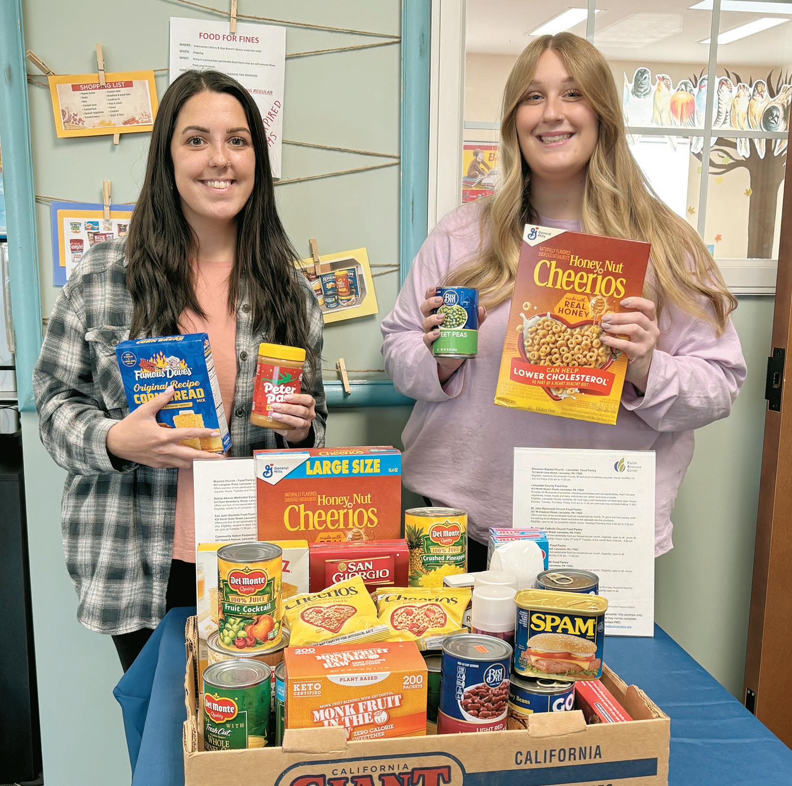 The Intercourse Library, represented by staff members Madison Cadiz (left) and Grace Purcell, is currently forgiving fines for those who donate a nonperishable food item. Those without fines are also invited to contribute to the food drive. Photo by Francine Fulton
