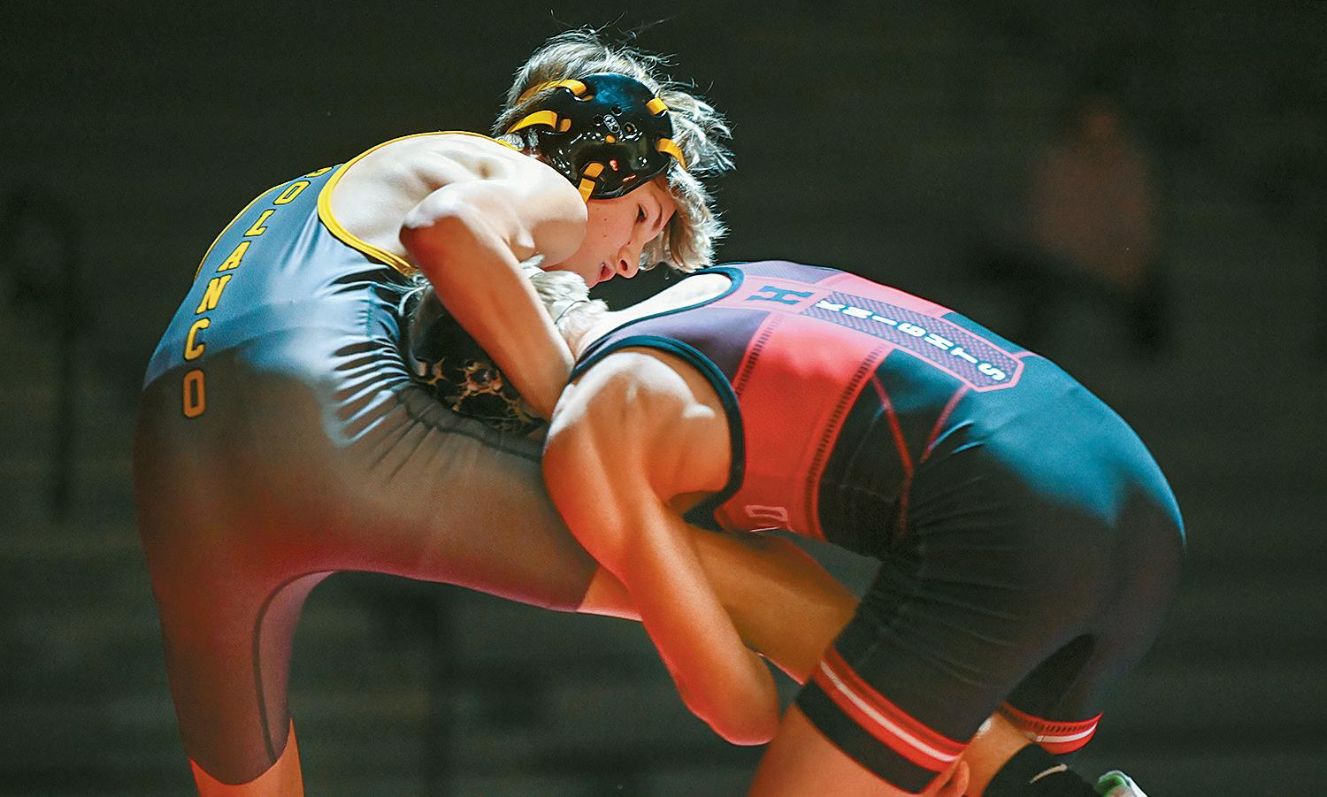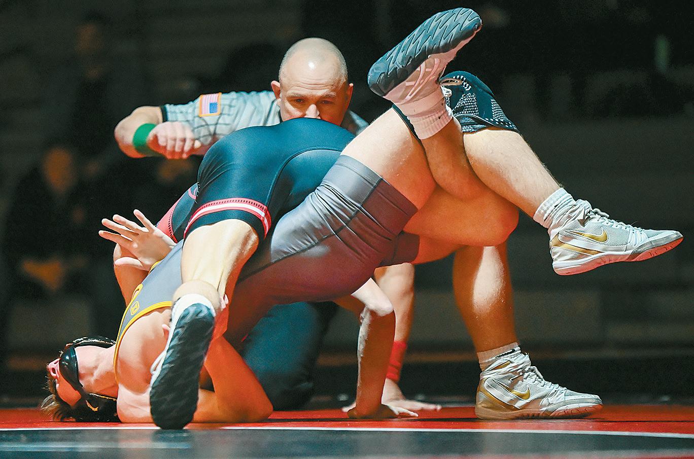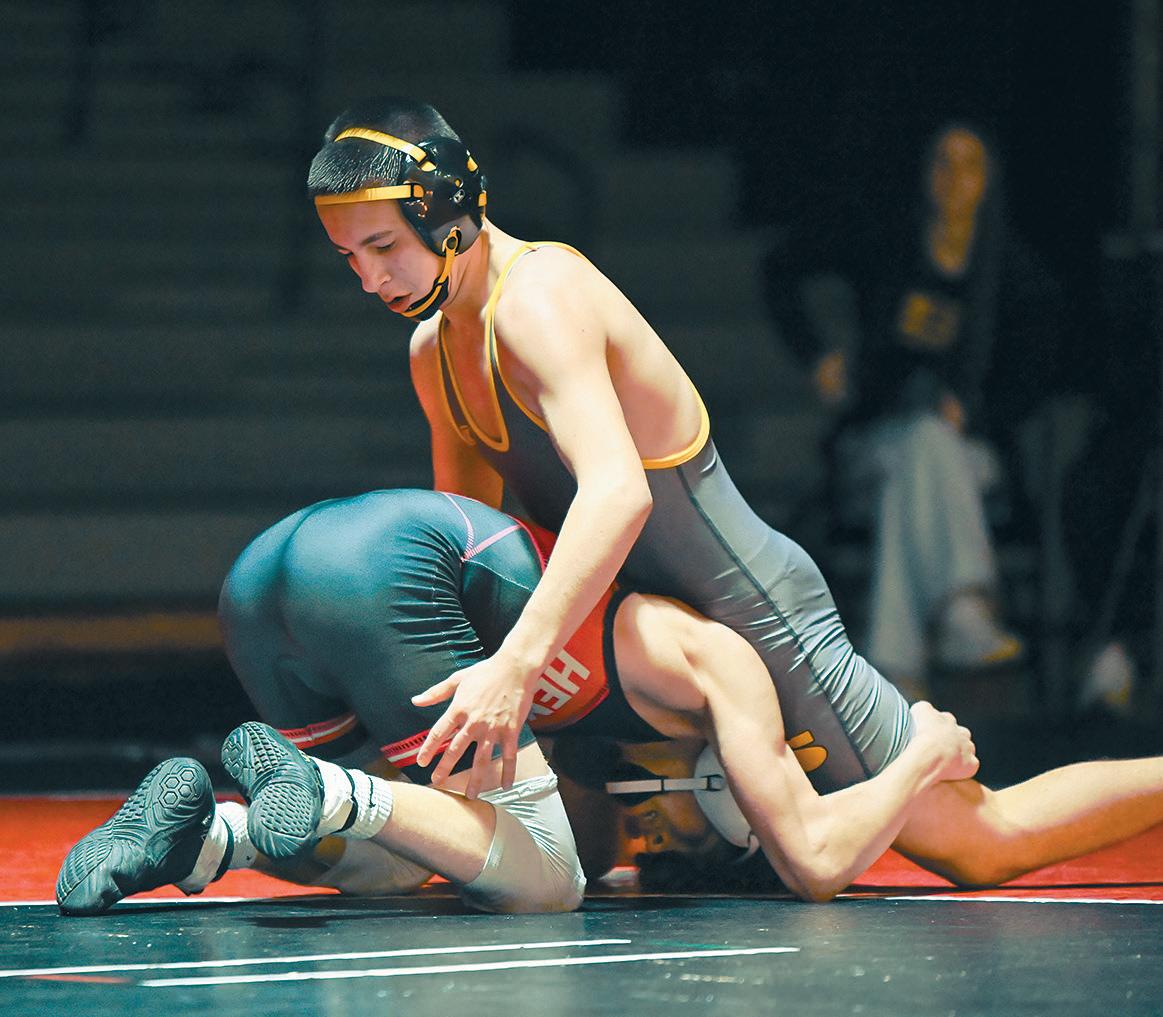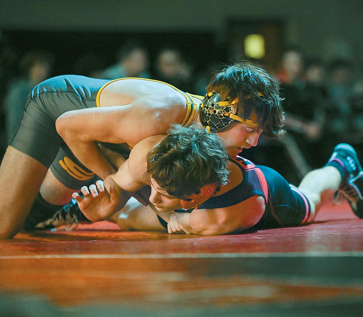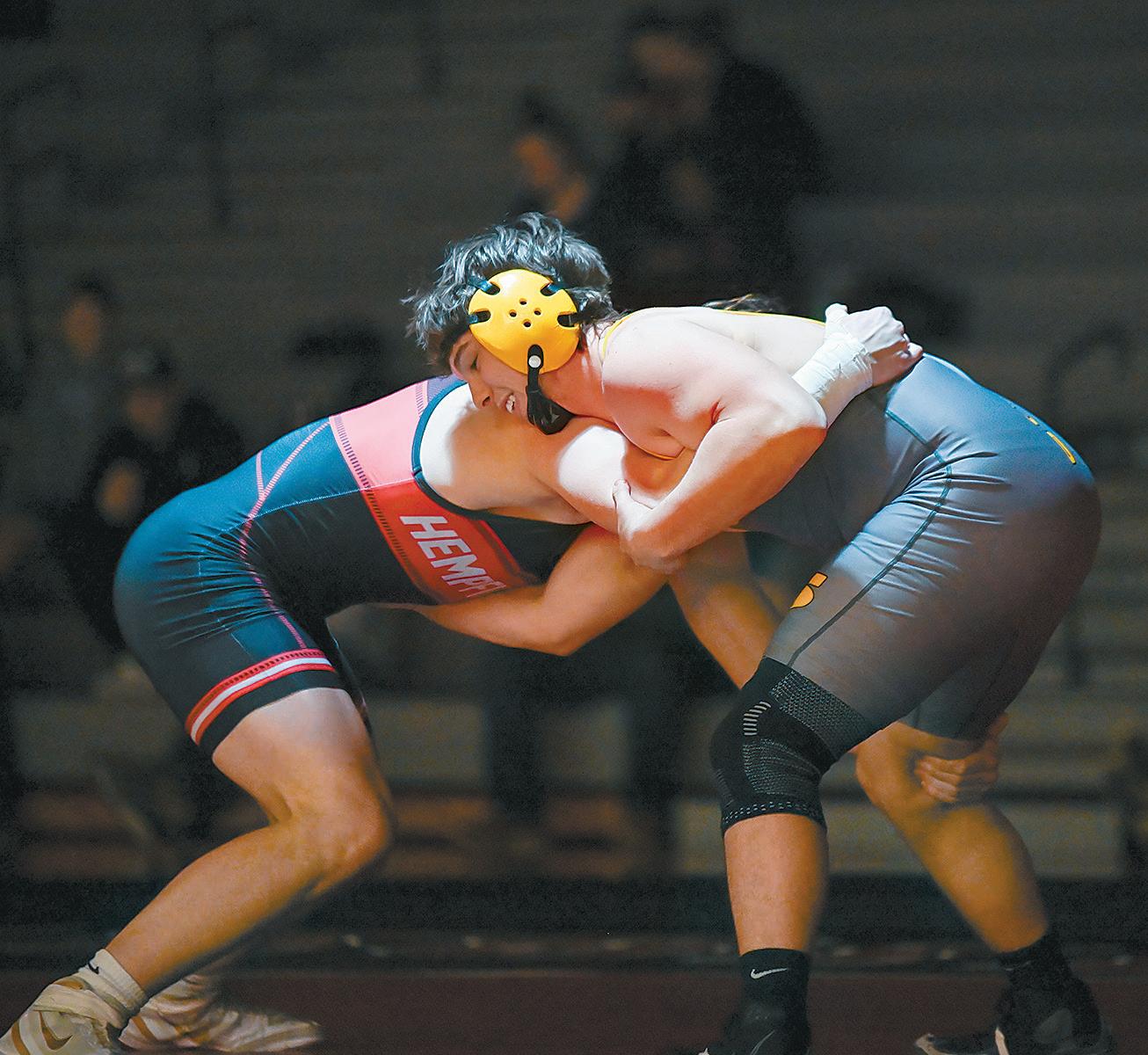 The Mules’ Garrett Aukamp works the top of Hempfield’s Teitjen Abel during a 49-19 loss on Wednesday, January 21. photos by Adam Shriver