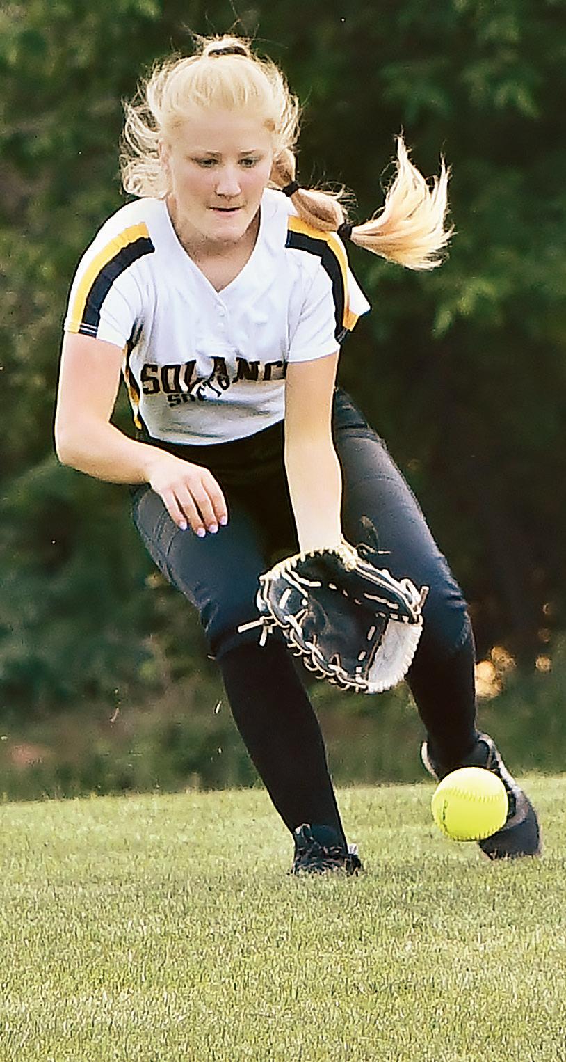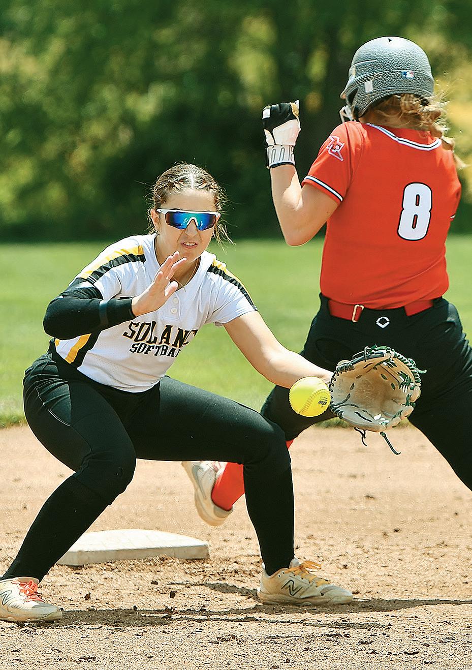 Against Section Four runner-up Annville-Cleona Saturday morning, May 11, Solanco’s Emily Simms looks to handle the throw to second base as the Little Dutchman’s Danika Setlock safely steps to the bag. The visitors went on to win 3-0 in the opening round of the L-L League playoffs.