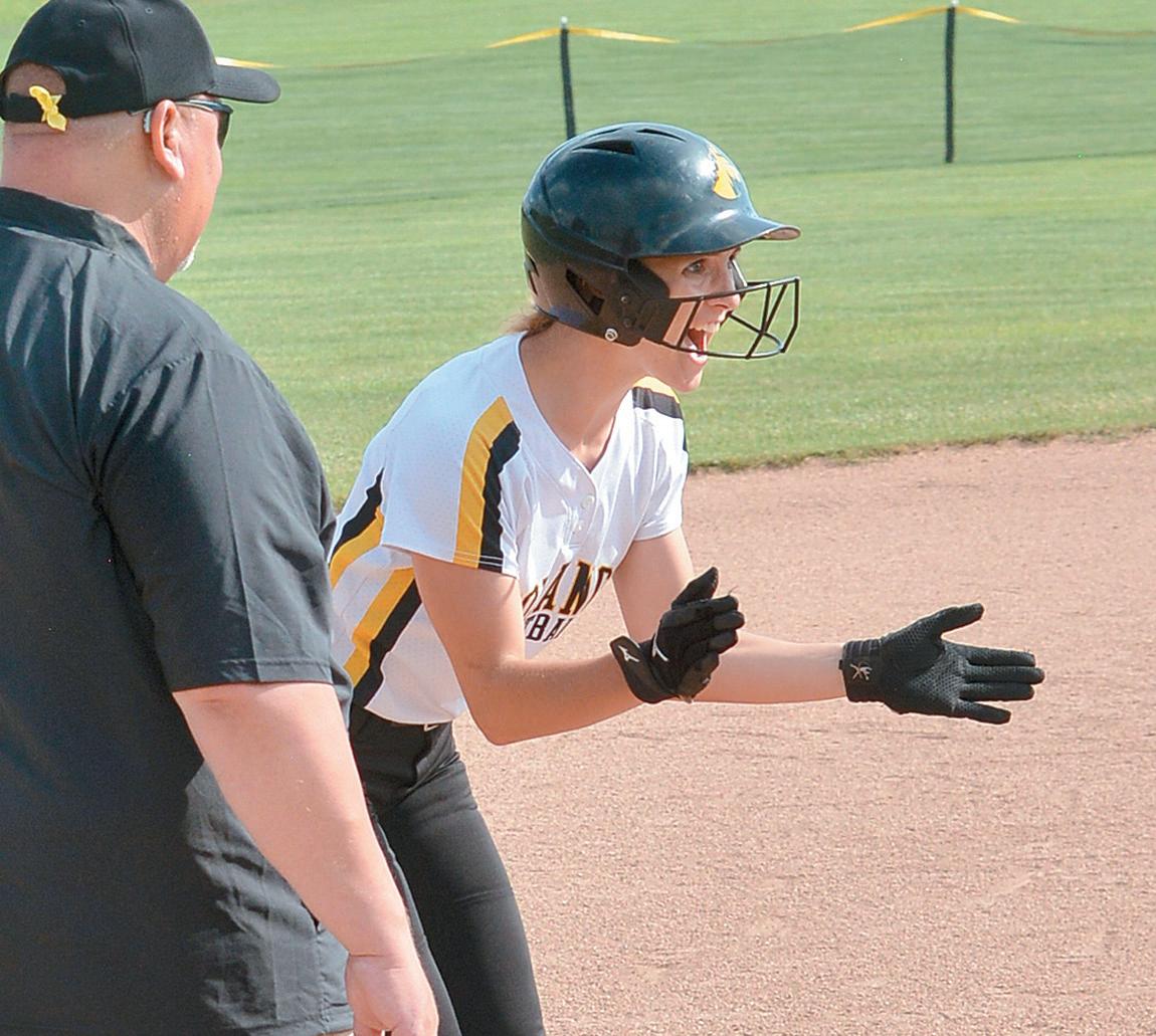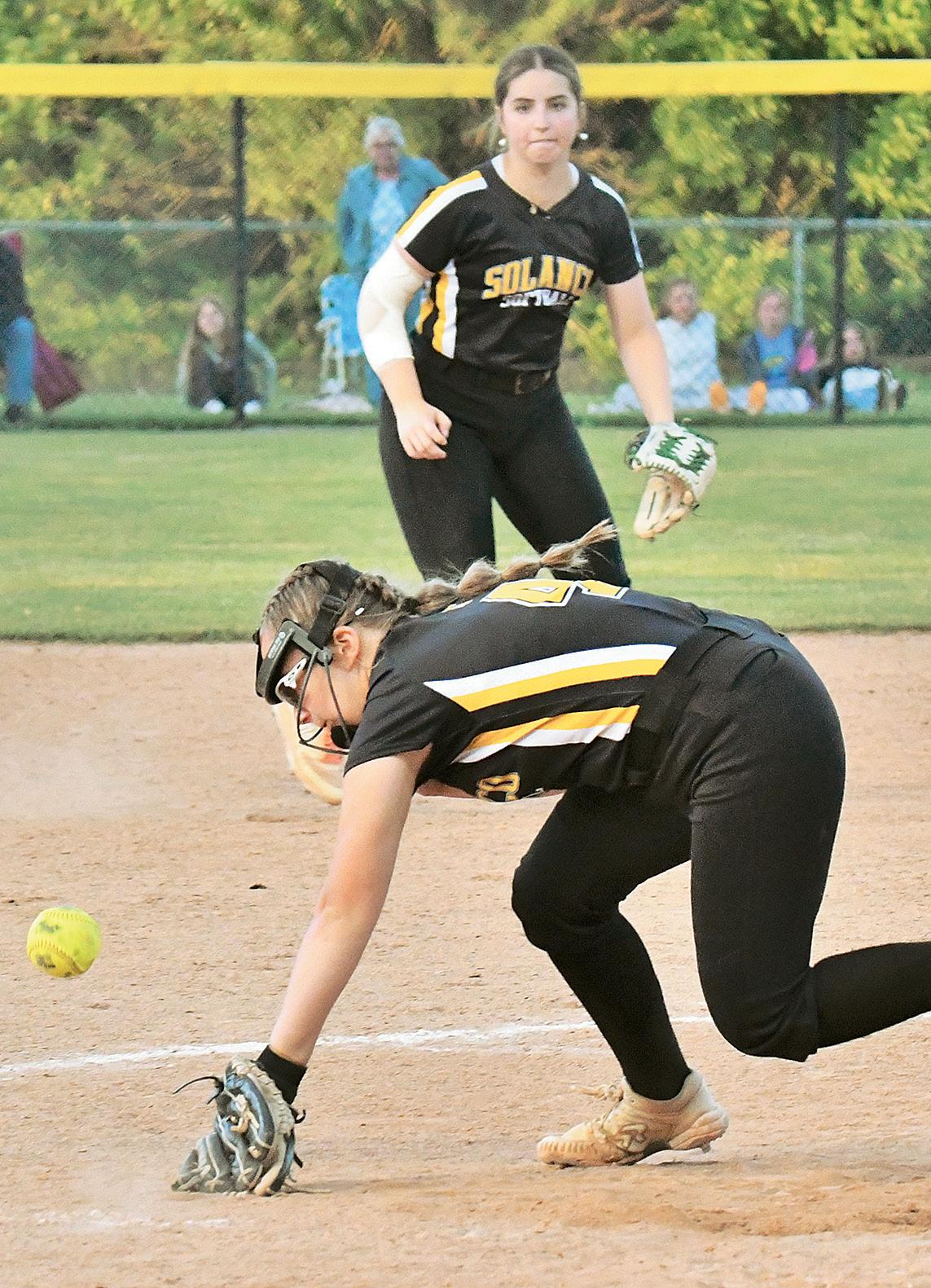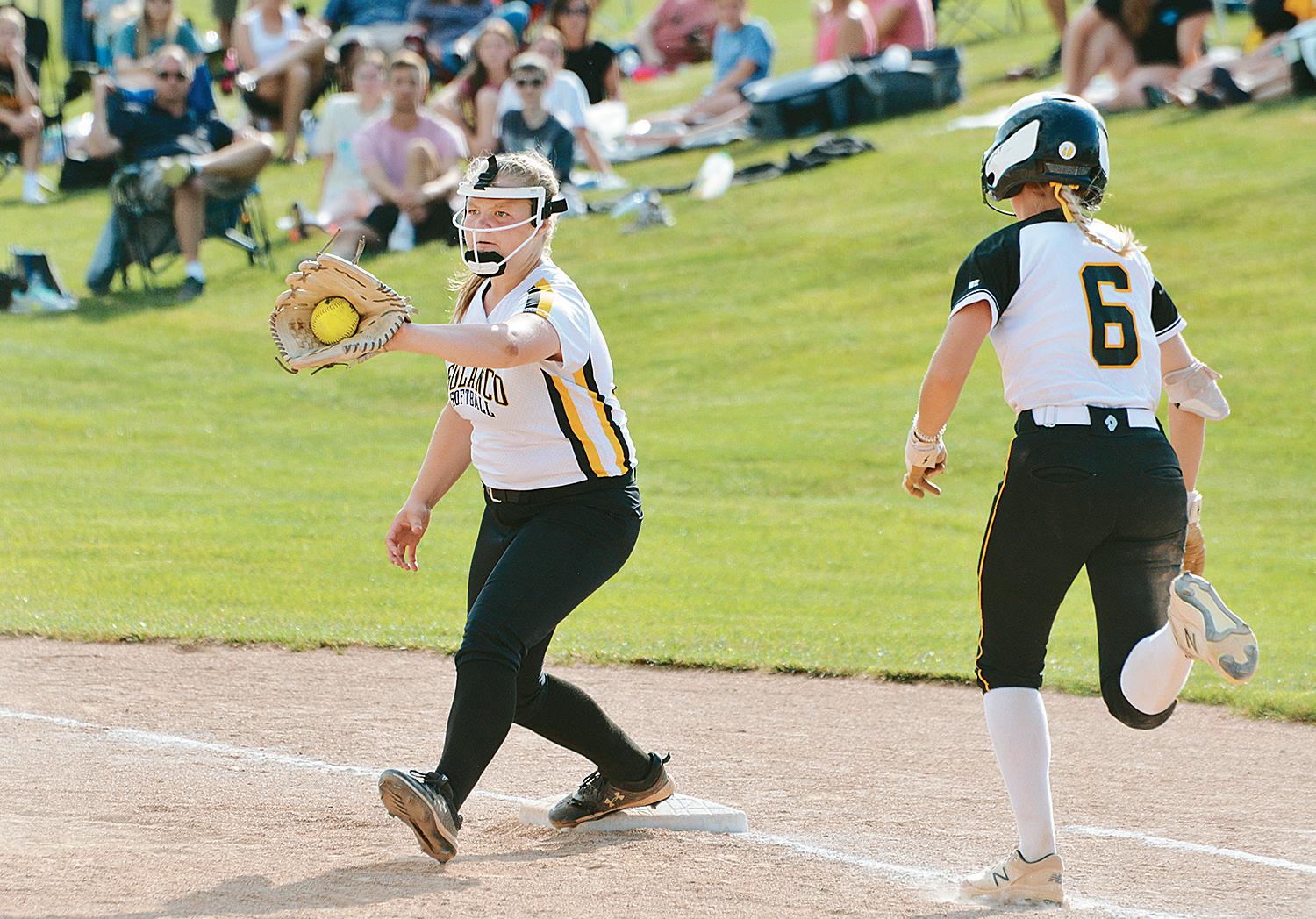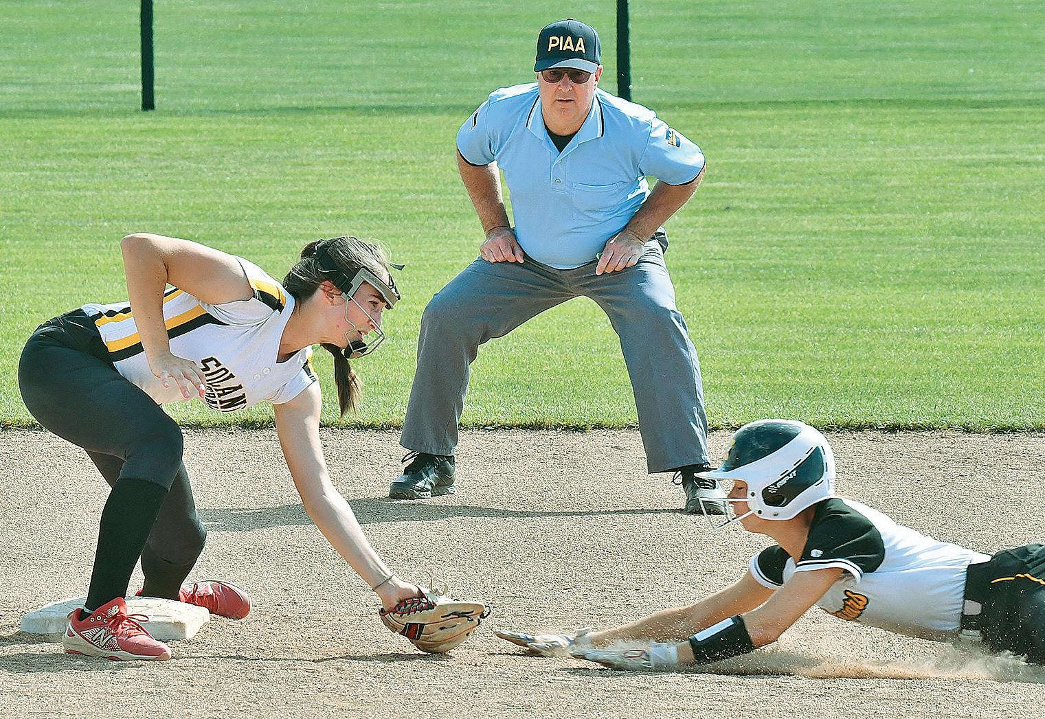 Backed by a hometown crowd, Solanco’s Olivia Musser snags the putout throw ahead of Thomas Jefferson’s Hannah Alonso in the opening round of the PIAA Class 5A bracket on Monday, June 3. The District Seven runners-up ended Solanco’s season with a 17-4 loss.