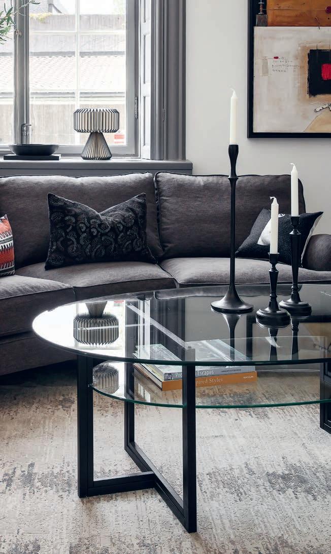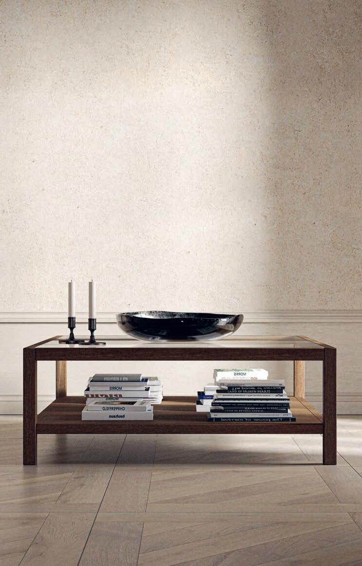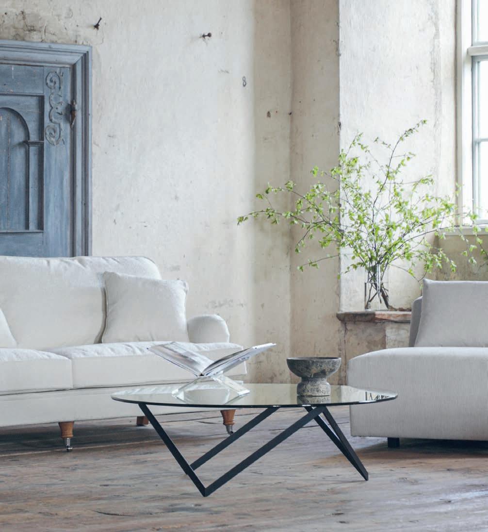 Brutus Vår karaktärsfulla serie av bord. Den avrundade formen av glasskivorna skapar en perfekt kontrast mot de breda vinkelräta ramarna av trä.