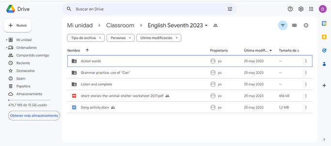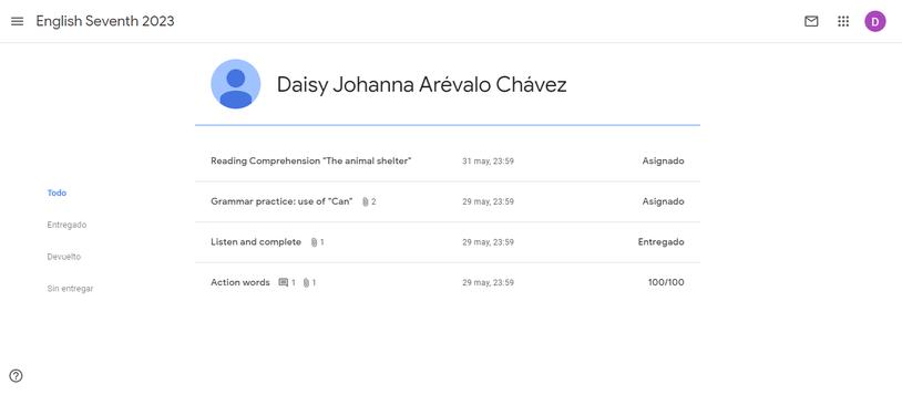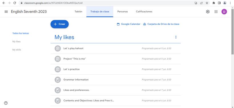 Al hacer click en la pestaña "Trabajo de clase" podrás acceder a las tareas, el calendario y la carpeta drive de la clase.