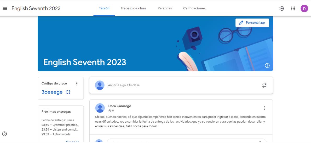Allí aparecen los anuncios de tus profesores, relacionados con la publicación de documentos, asignación de tareas, fechas de entrega. También podrás hacer comentarios o preguntas.