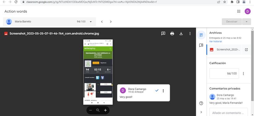 Desde del modo docente, en la pestaña “Trabajos en clase”, se puede abrir los documentos de tarea, entregados por el estudiante, para ser evaluados y asignar la calificación.