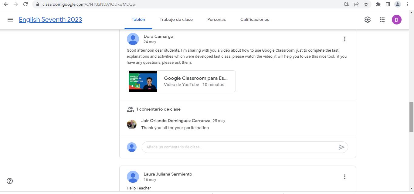 3. Ya en Google classroom, según la función se podrá ver la clase como estudiante o crear la clase como docente. Para ingesar a English Seventh 2023 se debe dar click sobre el link: https://classroom.google.com/c/NTUzNDA1ODkwMDQw