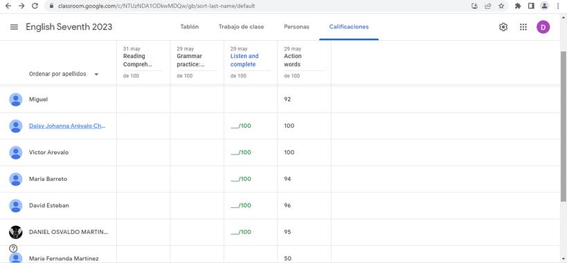En la pestaña “Calificaciones” aparecen los datos y calificaciones por grupo, de acuerdo con las actividades entregadas por los estudiante, según tema y fecha de entrega; aquí se puede observar el estado de entrega (Completada, Sin entregar o Fuera de tiempo) y todas las calificaciones de los estudiantes. Desde aquí también se pueden devolver las tareas a los estudiantes para realizar correcciones