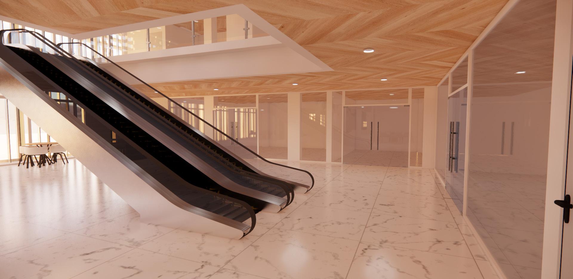 Vista de las escaleras mecanicas con parte los locales comerciales