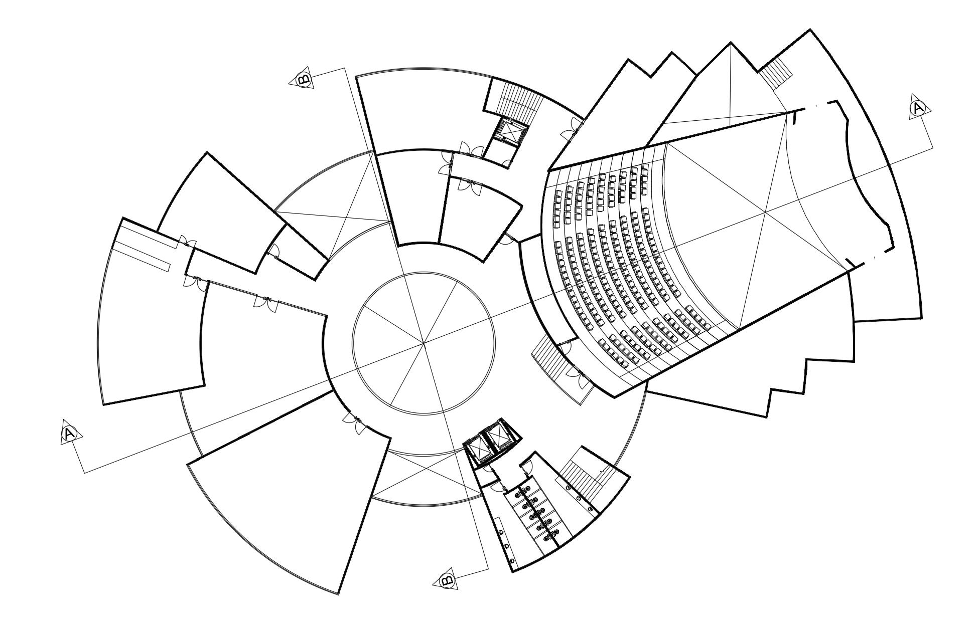 En la sala del escenario, se destaca un amplio y fluido espacio abierto, diseñado para ofrecer una experiencia cómoda y visualmente impactante a los 500 espectadores. Las sillas están organizadas en filas ordenadas, distribuidas de manera estratégica en dos niveles: el nivel 1 y el nivel 2 de asientos, permitiendo una visibilidad clara del escenario desde todos los puntos. Además, el diseño incorpora un foso de orquesta, esencial para presentaciones musicales en vivo, y espacios específicamente adaptados para personas con discapacidades, asegurando que la sala sea accesible y funcional para todos los usuarios.