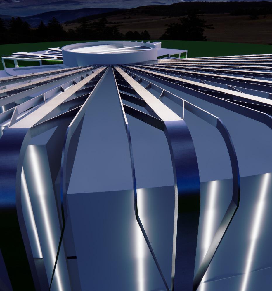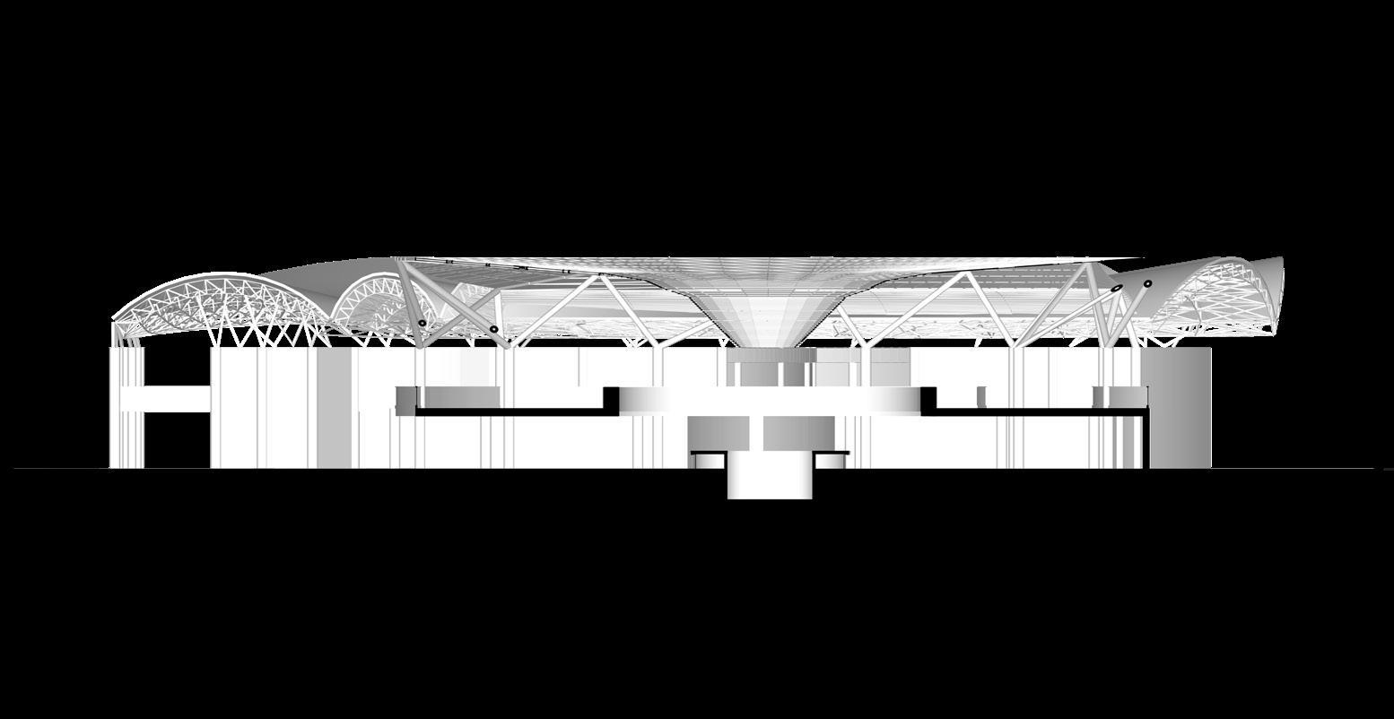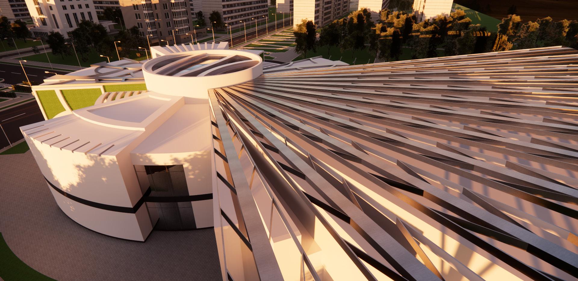 El concepto de diseño está inspirado en la idea de ‘burbujas’, una serie de espacios adaptados para las diferentes áreas necesarias en un teatro. Estas burbujas representan zonas funcionales como el escenario, los salones de práctica, las áreas de acceso público y los locales comerciales que rodean el teatro, creando una experiencia completa para el espectador. La disposición circular de estas burbujas permite la interconexión fluida de las diferentes áreas, lo que favorece una circulación intuitiva y una interacción constante entre los espacios. Además, las burbujas están interconectadas por vigas suspendidas que, al ser dispuestas en diferentes direcciones, crean una forma que recuerda a una pluma que adorna la estructura y define el carácter icónico del edificio. Así, este proyecto se convierte no solo en un lugar para el arte, sino también en una obra arquitectónica que aporta un sentido estético único a su entorno.