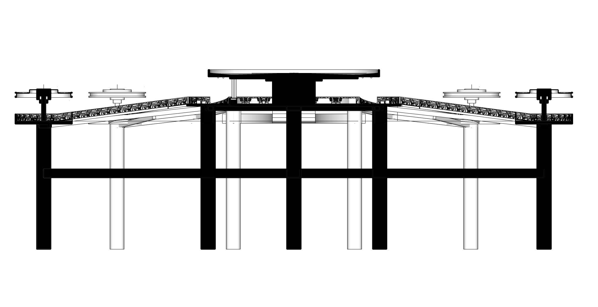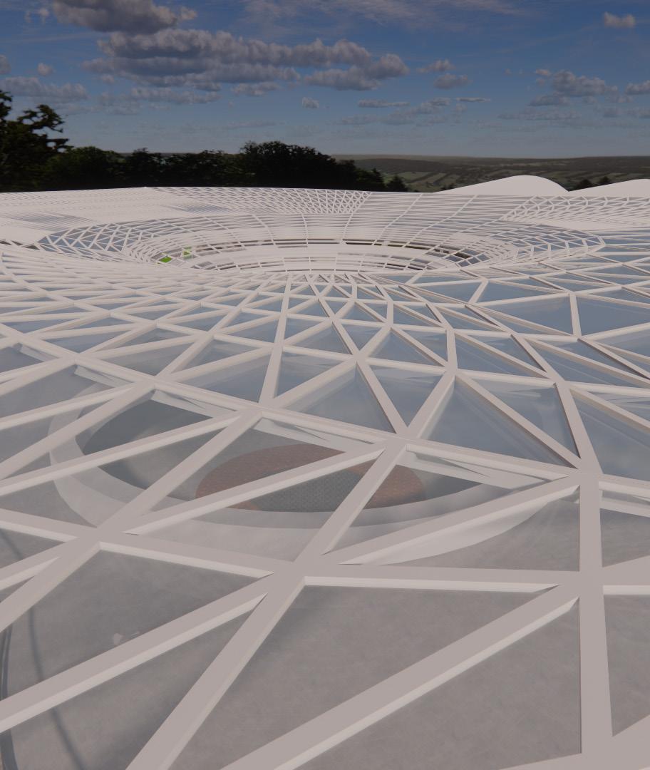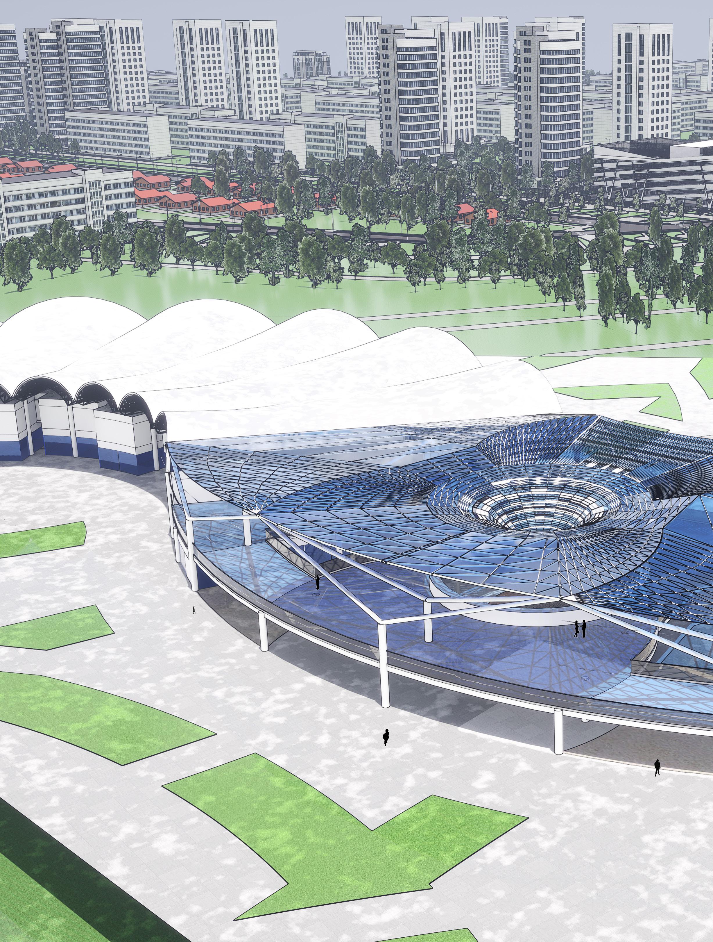 El concepto de diseño está inspirado en la idea de ‘burbujas’, una serie de espacios adaptados para las diferentes áreas necesarias en un teatro. Estas burbujas representan zonas funcionales como el escenario, los salones de práctica, las áreas de acceso público y los locales comerciales que rodean el teatro, creando una experiencia completa para el espectador. La disposición circular de estas burbujas permite la interconexión fluida de las diferentes áreas, lo que favorece una circulación intuitiva y una interacción constante entre los espacios. Además, las burbujas están interconectadas por vigas suspendidas que, al ser dispuestas en diferentes direcciones, crean una forma que recuerda a una pluma que adorna la estructura y define el carácter icónico del edificio. Así, este proyecto se convierte no solo en un lugar para el arte, sino también en una obra arquitectónica que aporta un sentido estético único a su entorno.