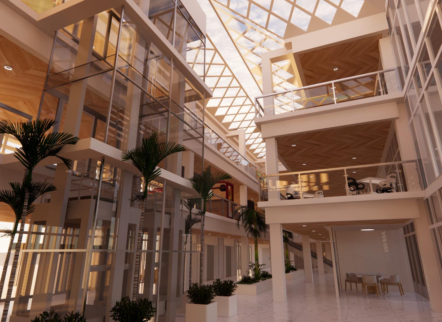 Perspectiva general del interior del edificio en donde se aprecia los tres pisos