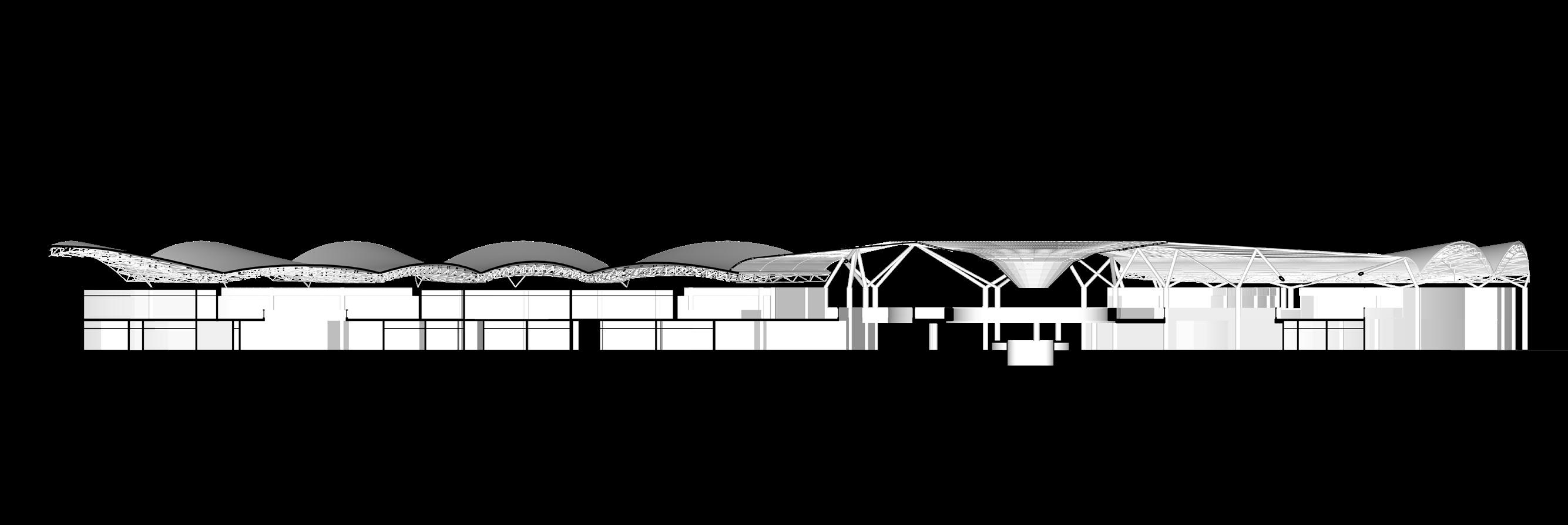La obra presenta una imponente fachada frontal que destaca por su diseño arquitectónico futurista y su estética innovadora, la cual marca una diferencia clara con los estilos tradicionales.