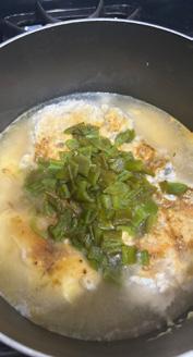 In a large saucepan or pot, combine the soups and water/milk, garlic powder, onion powder, bouillon powder, and diced peppers. Mix well to combine and cook over medium heat until boiling, stirring occasionally. Reduce heat to low once boiling. In the meantime, while the soup is heating, heat the oil in a small frying pan until hot. Place one tortilla at a time into oil and let cook for about 10 seconds, flip, repeat on other side. Remove from oil and place on a paper towel lined plate. Continue with all tortillas desired.