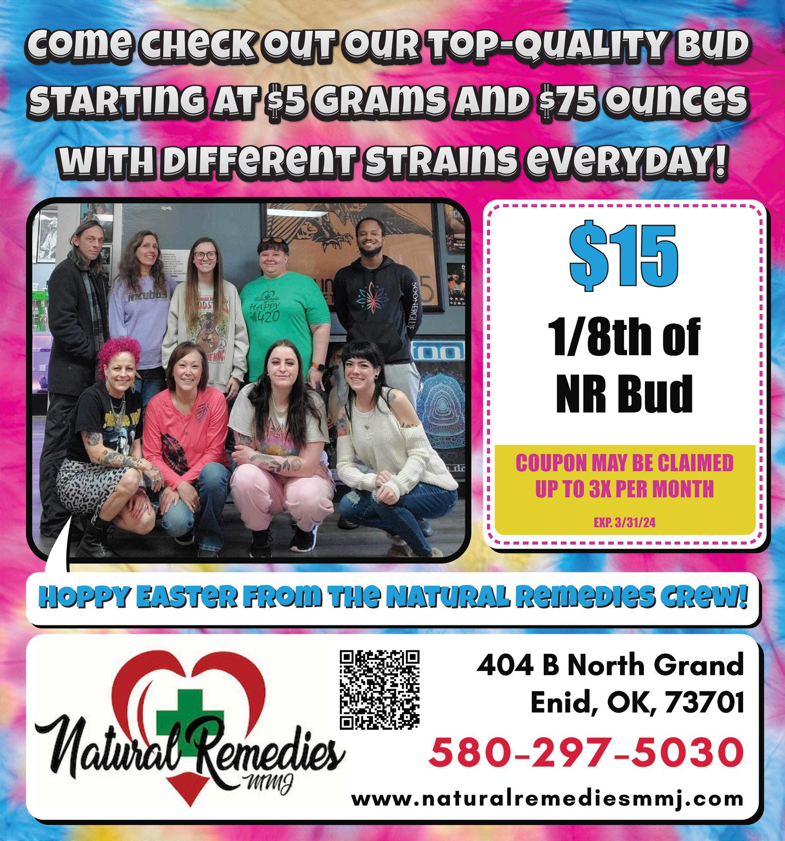 Tristan Cross is the Executive Director at Natural Remedies, and she runs their family-owned dispensary, Natural Remedies MMJ. Before running the store, she worked there for 5 years. She’s held her current position for 1 year, and taking on that promotion is a moment she treasures more than most. As the Executive Director for Natural Remedies, she handles most of the dayto-day operations, and she helps run the dispensary along side her parents, who are the co-owners. When it comes to where she is today, she credits her parents. She states, “I credit my parents for where I am today because without them, I wouldn’t even have the opportunity to be here.” Tristan’s parents have set her up for success in more than one way, but, as an adult, her success is now her own as well. Natural Remedies has won Best Dispensary at the annual Best of Enid event two years in a row now, and that effort may not be an individual effort, but there is a leader for every team, and at Natural Remedies, that leader is