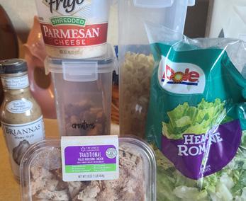2. Cut hearts of Romaine into 1 inch pieces and shred rotisserie chicken then add to the large bowl with pasta.