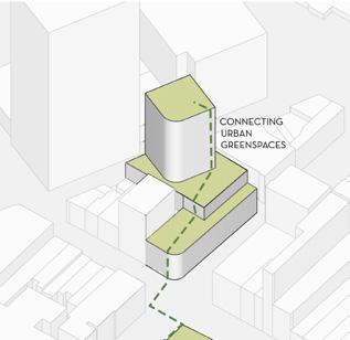 The design considers the fabric of the surrounding city, providing a connection to nearby greenspaces, a street edge that engages with the neighboring skyscrapers and a sustinable mixed use hosing option for residents to