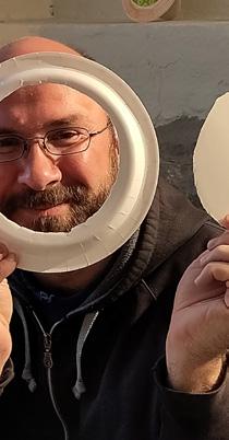 Und so geht‘s: 1. Nimm Dir einen der Pappteller und falte ihn in der Hälfe. Achte darauf, dass die beschichte Seite nach innen gefaltet ist.