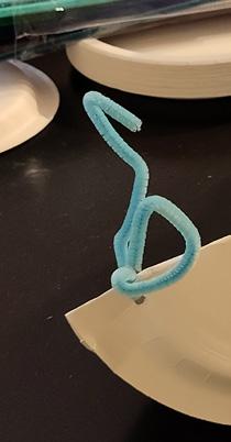 3. Durch das Loch kannst Du nun Deinen Pfeifenputzer stecken, sodass auf jeder Seite Deiner Schnecke nun ein halber Pfeifenputzer herausschaut. Biege diesen nach oben und verdrehe ihn über dem Teller. Nun kannst Du ihn so biegen, dass Dir die Fühler gefallen. Und schon ist Dein Schneckenkörper fertig.
