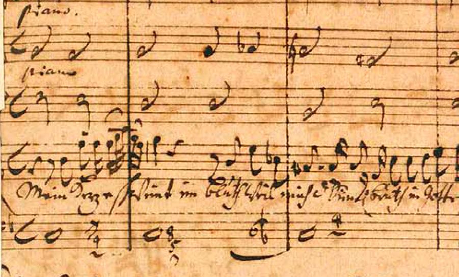 Aus dem Autograph Bach ein Detail „Mein Herze schwimmt im Blut“. Textanfang ist erkennbar.