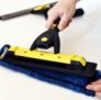 STEP 2: Slide one end of the Floorcleaner Plate into one of the pockets of the Floorfibre. Open the ‘Open/Close’ lever by pressing down on the ‘Open’ side of lever. Lift the Plate and push the Plate down into the corners of the Floorfibre.