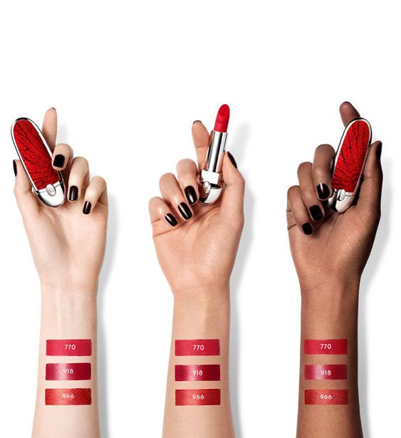 Palet ‘Ombre G nr 770 Red Vanda’ uit de Red Orchid-zomerlook werd samengesteld door creative director Violette en is een mooi kwartet van roodtinten en goud. Guerlains Rouge G lipstickcollectie werd bovendien uitgebreid, met ook een nieuwe - vuurrodenavulbare huls.