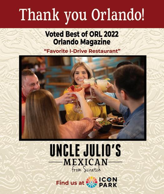LUNCH & DINNER 11:30 AM to 11:00 PM EVERY DAY Across from Sea World AWARD WINNING! VOTED ONE OF THE BEST THAI RESTAURANTS IN THE USA BY THE THAI GOVERNMENT! We have come a long way to prove ourselves! 11025 International Drive Orlando, FL 32821 407-239-9733 www.thaithani.net WE DELIVER! (Orlando location only) 10% OFF Entree only. One coupon per table. Not valid with other offers. Expires 8/31/23. ENJ Seafood Restaurant A Southern Tradition Since 1973 Fresh Catfish Daily from Lake Okeechobee • Frog Legs • Oysters • Chicken • Gator • Turtle • Chops • Shrimp • Steaks • Burgers “Where the local folks eat.” 2324 13th St, St. Cloud, FL 34769 • 407-892-5771 East of Kissimmee on Hwy 192 at Alabama Ave 10% OFF On Meals with this coupon. Not valid with 2-for-1 offers. Expires 8/31/23. Code: ENJ RITA’S OF LAKE BUENA VISTA 11567 REGENCY VILLAGE DRIVE ORLANDO, FL 32821 • (407) 239-4494 RITASOFLAKEBUENAVISTA RITA’S OF INTERNATIONAL DRIVE 5931 INTERNATIONAL DRIVE, SUITE 101 ORLANDO, FL 32821 • (407) 313-9452 RITASOFINTERNATIONALDRIVEFL RITA’S OF INTERNATIONAL DRIVE NOW OPEN! © 2022 RI A FRANCHISE COM P AN Y L L C. ALL RIGH T S R SERVE D V ALID A T P A R TICI P TING L OC TIONS. B U Y 1 , G E T 1 FR E E Valid at participating Rita’s locations, excluding cart and theme park venues. Discount applied to lowest priced item. Not valid with any other o er. Limit one o er per guest per visit. Not valid on online or delivery orders, catering, or take home treats. Other restrictions may apply. Not for resale. ©2022 RITA’S FRANCHISE COMPANY, LLC. ALL RIGHTS RESERVED. Expires 8/31/2023. Code: EFM