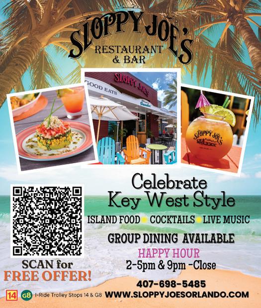 ENJOY FLORIDA MAGAZINE - KISSIMMEE DECEMBER 2022 - APRIL 2023 49 CASUAL ATMOSPHERE DAILY FOOD & DRINK SPECIALS 10%OFF Notvalidwithanyotheroffers, discountsorpromotions. Expires8/31/23. Code:ENJ FOODONLY (Notvalidforsnowcrabentrées) 7675 W Irlo Bronson Hwy, Kissimmee | 407-507-3899 Next to Mile Marker 5 on Hwy 192 inside Comfort Inn 15771 S Apopka Vineland Rd, Orlando | 407-217-6030 Inside the Lake Buena Vista Factory Stores on SR 535 www.NantucketShrimpShack.com LIVE LIKE A LOCAL, EXPLORE LIKE A TOURIST .COM SCAN HERE TO GO TO ENJOYFLORIDA.COM OR VISIT US AT: @ENJOYFL @ENJOYFL /ENJOYFL FOR INFO ABOUT ALL THE FUN THINGS TO DO IN FLORIDA, VISIT US ONLINE AT