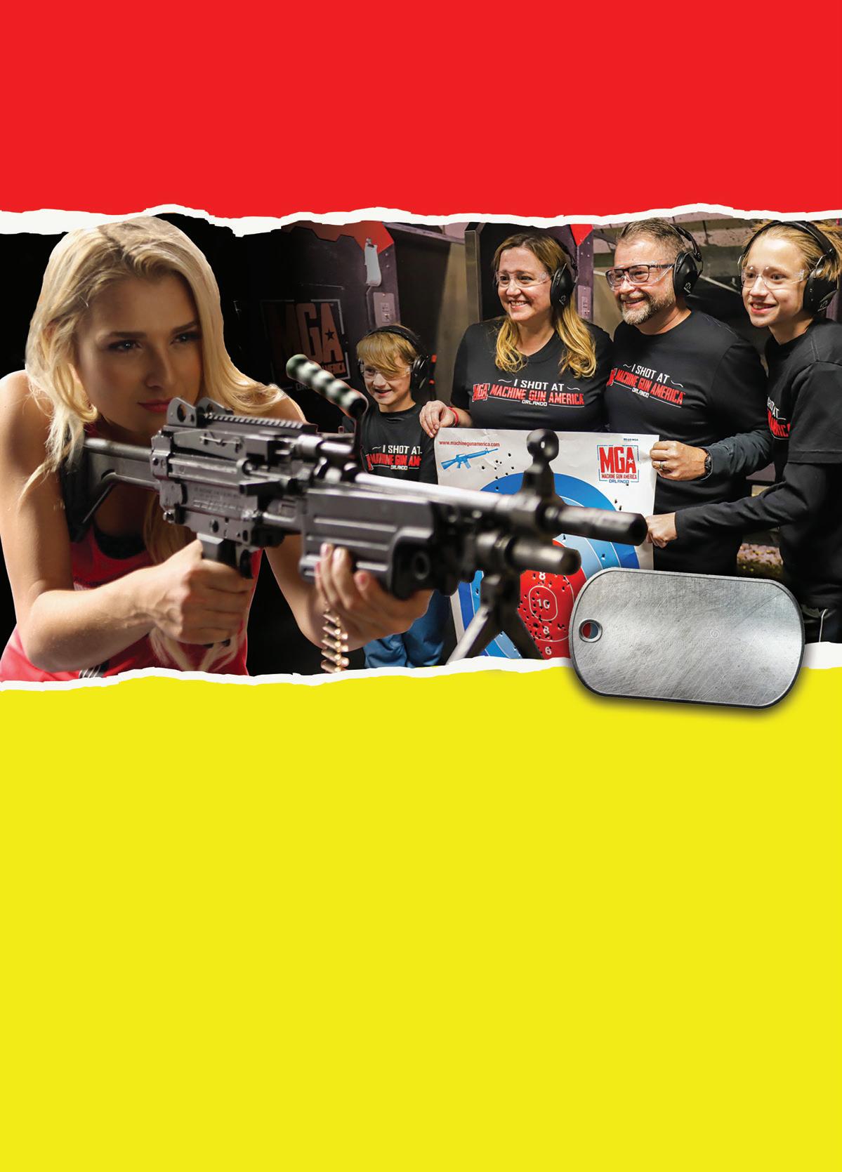 SHOOT REAL MACHINE GUNS! SHOOT REAL *Only valid on the live shooting packages “Pick 3” and above. Cannot be combined with any other coupon or offer. All minors must be accompanied by a parent. Restrictions apply See your MGA representative for details. Exp 8/31/23. Code: EFL RATED #1 407.507.6256 | MachineGunA mer ica.com 5825 W. Irlo Bronson Memorial Hw y. Kissimmee, FL 34746 FUN FOR THE ENTIRE FAMILY! F ir e li ve r ounds f r om our r ar e, f ull y au t oma t ic fir ear ms in unique exper iences OR t ake ou t bad gu ys in our New V ir t ual Reali t y ! Our Range Sa fe t y O ff icer s w ill be t eaching you dir ec t l y, w hile explaining t he fir ear ms t hr oughou t your exper ience. MG A is t he ONLY shoo t ing a t t r ac t ion w it h ONE on ONE, speciall y t r ained, highl y exper ienced Range Sa f e t y O icer s by your side t hr oughou t. S can t he Q R Code wit h your phone for det ails.