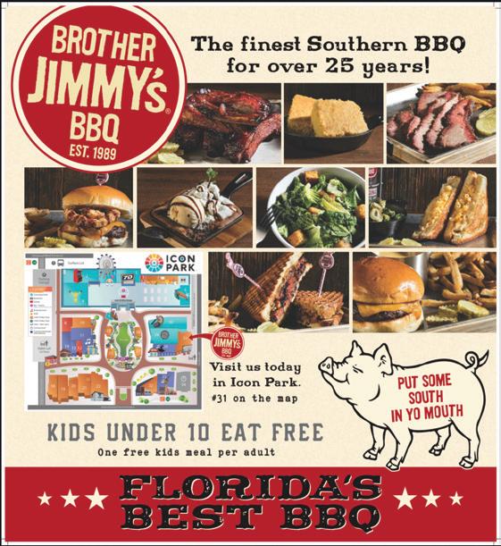 Brother Jimmy’s has celebrated over 25 years of legendary North Carolina, slow-smokin’ barbeque. As suggested by the restaurant’s slogan – “Put Some South in Yo’ Mouth” –Brother Jimmy’s mission is, to bring “downhome” cooking, hospitality and merriment to the heart of the Orlando. Now established in ICON Park on famous International Drive, Jimmy’s offers incomparable cuisine that reminds natives what good ‘ol Southern hospitality is all about, and shows Florida vacationers just what they’d been missing all these years. For more details see our ad on page 31.