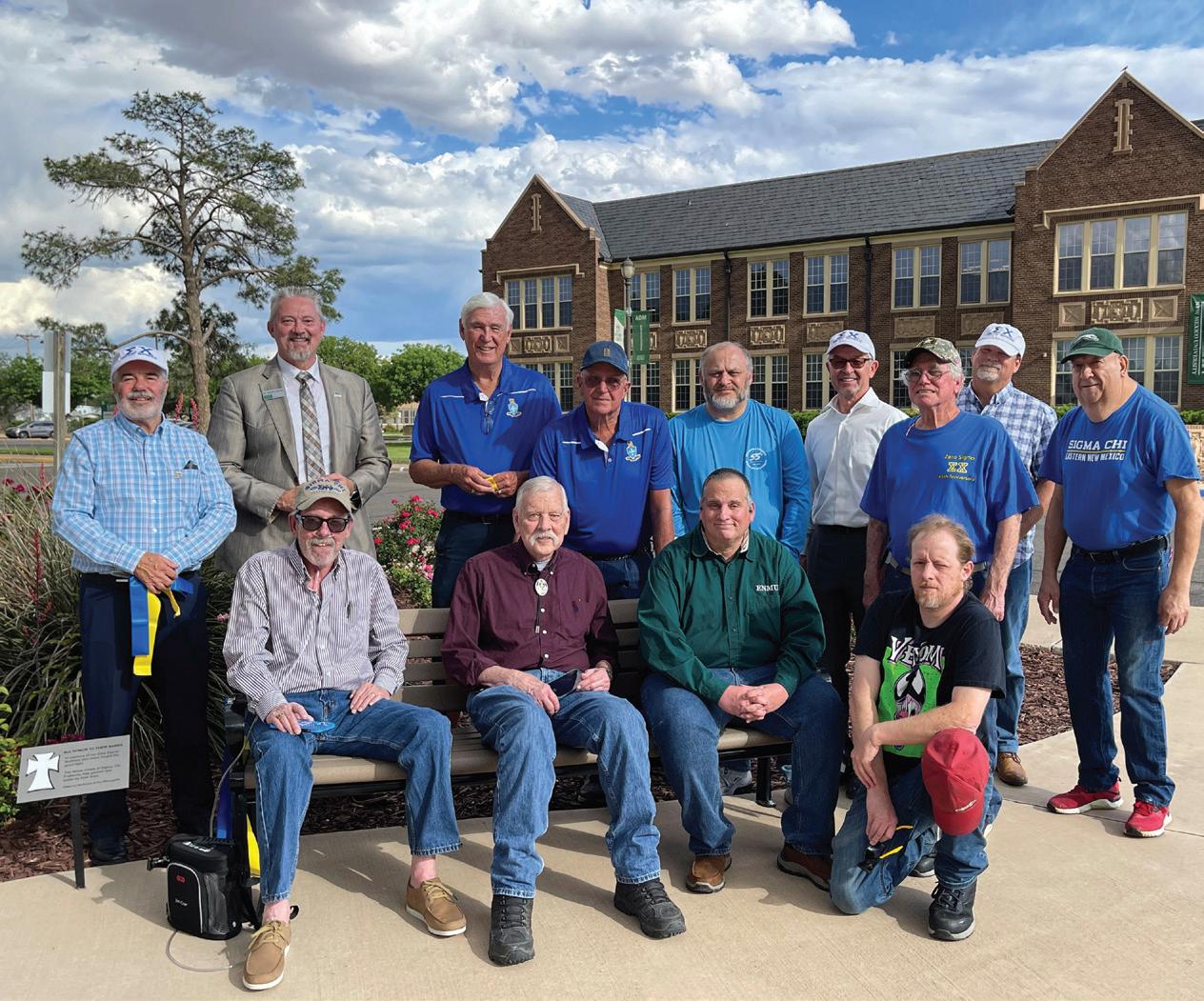 Alumni Members of the Zeta Sigma chapter of the Sigma Chi fraternity joined ENMU Chancellor Dr. James Johnston in May to dedicate a memorial bench and plaque in front of the Administration Building. Pictured are standing, left to right: Dave Mathews (BS 80), Dr. Johnston, David Porter (MED 83, BS 69), Gary Robbins (BBA 73), Dwayne Grenko (BUS 05), Bob Goldsborough (BS 80), Tom Meadows (BS 71), Mark Bergman (BBA 87), and John Armijo (BA 84). Front row, left to right: J.R. Jacobs (Attended), Larry Brock (BS 72), Matthew Gormley (BS 95), and Joshua McCarty (BBA 08).
