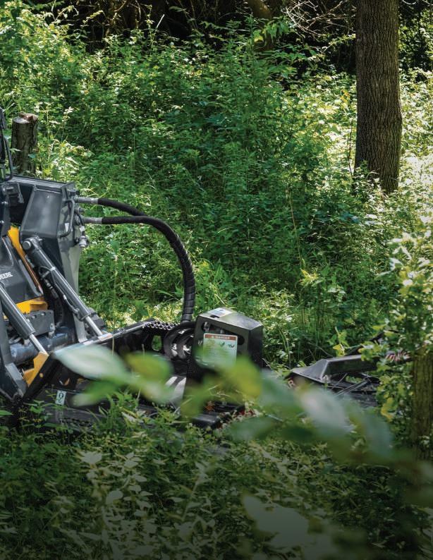 A rugged root rake, rotary cutter, or mulching head can help tackle tough land-clearing tasks.