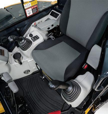 Spacious operator station has a wide entryway and backhoe- to excavator-style controls. Swing boom and foldable travel pedals are positioned for efficient operation and comfortable foot room. Noise-reducing aftertreatment device and isochronous high-idle speed help keep things noticeably quiet. Rubber cab mounts isolate the operator from noise and vibration.