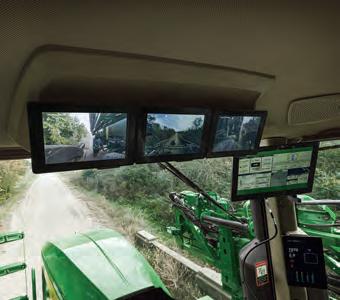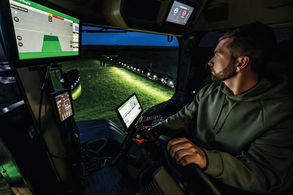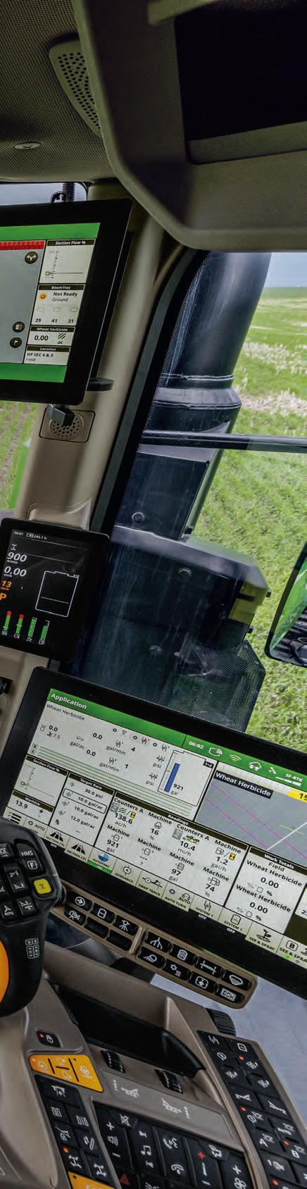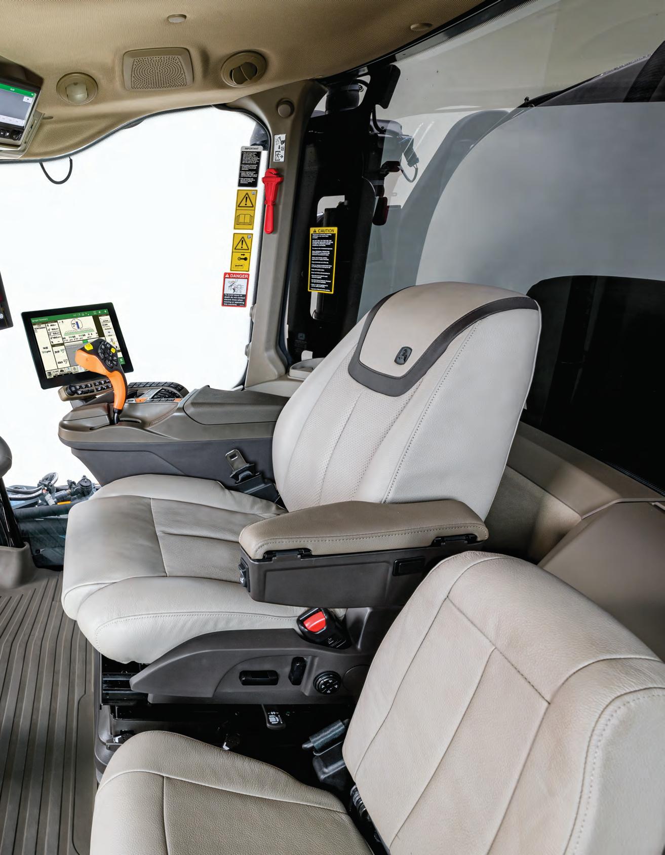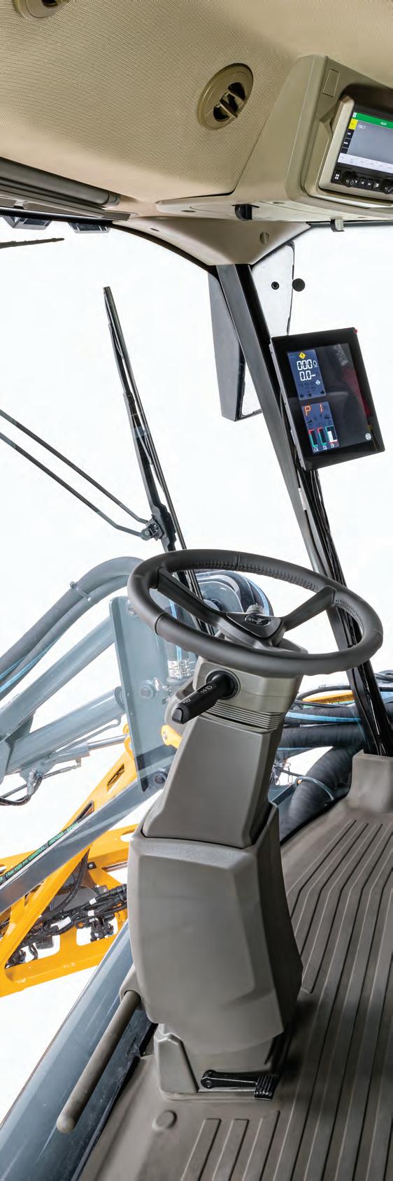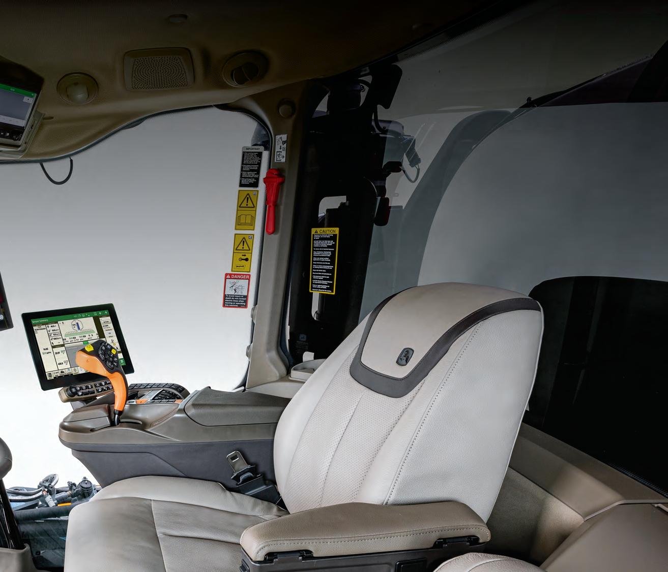 Transform the cab of your John Deere sprayer into a truly operatorfocused workspace. Visibility packages range from Premium to Ultimate, featuring up to 17 LED lights, multiple beacons, heated and electrically adjustable mirrors, sunshades, wipers, and an integrated camera system with rear and side views to ensure confident operation day or night. Inside, choose from Select or fully loaded Ultimate Comfort & Convenience, moving from a well-equipped cloth seat and simple infotainment to an ActiveSeat™ II leather seat with heating, ventilation, and fatigue prevention, a 6.5 in (16.5 cm) touchscreen with premium audio, additional storage, and a refrigerator.