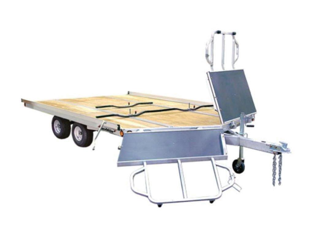 ATV128-2 TR, 152" x 79", aluminum trailer with marine grade plywood floor, twin ramps stored under trailer, torsion tandem axle, 2475lb carrying capacity