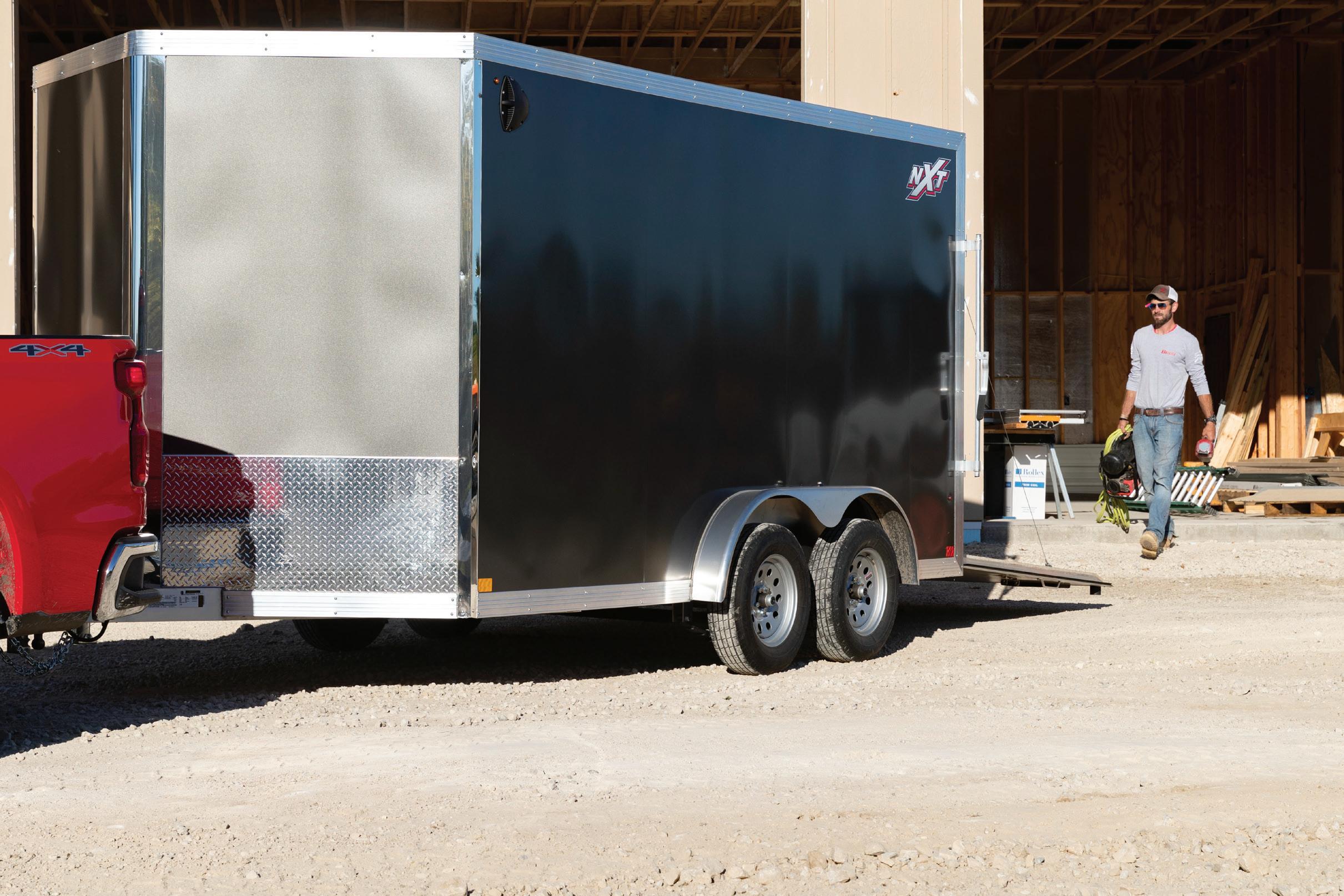 NXT714R enclosed cargo trailer, 14'x7', rear ramp door, 32"x72" side door, tandem leaf axle, electric brakes dual axle, spring assist, 6'10" height, LED lights, side vents, plywood walls, silver wheels, 5520lb carrying capacity, black, white, or charcoal in colour. Unit