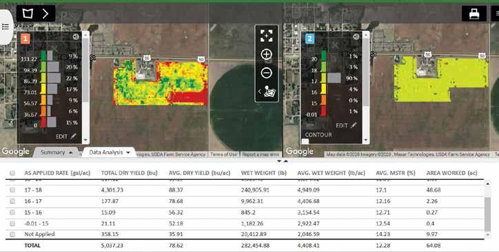 As further evidence of what happened, you can look at the Data Analysis drawer (the table of data below the maps), which shows not only harvest yield and application data, but application rate. In areas where no fungicide was applied, the yield was 53 bu/acre lower than the top-yield areas, where the product was applied at a rate of 17-18 gal/acre.