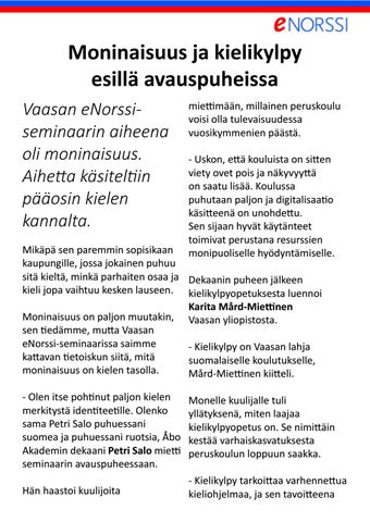 Mikäpä sen paremmin sopisikaan kaupungille, jossa jokainen puhuu sitä kieltä, minkä parhaiten osaa ja Dekaanin puheen jälkeen kieli jopa vaihtuu kesken lauseen. kielikylpyopetuksesta luennoi Karita Mård-Miettinen Moninaisuus on paljon muutakin, Vaasan yliopistosta. sen tiedämme, mutta Vaasan eNorssi-seminaarissa saimme - Kielikylpy on Vaasan lahja kattavan tietoiskun siitä, mitä suomalaiselle koulutukselle, moninaisuus on kielen tasolla. Mård-Miettinen kiitteli. - Olen itse pohtinut paljon kielen merkitystä identiteetille. Olenko sama Petri Salo puhuessani suomea ja puhuessani ruotsia, Åbo Akademin dekaani Petri Salo mietti seminaarin avauspuheessaan.
