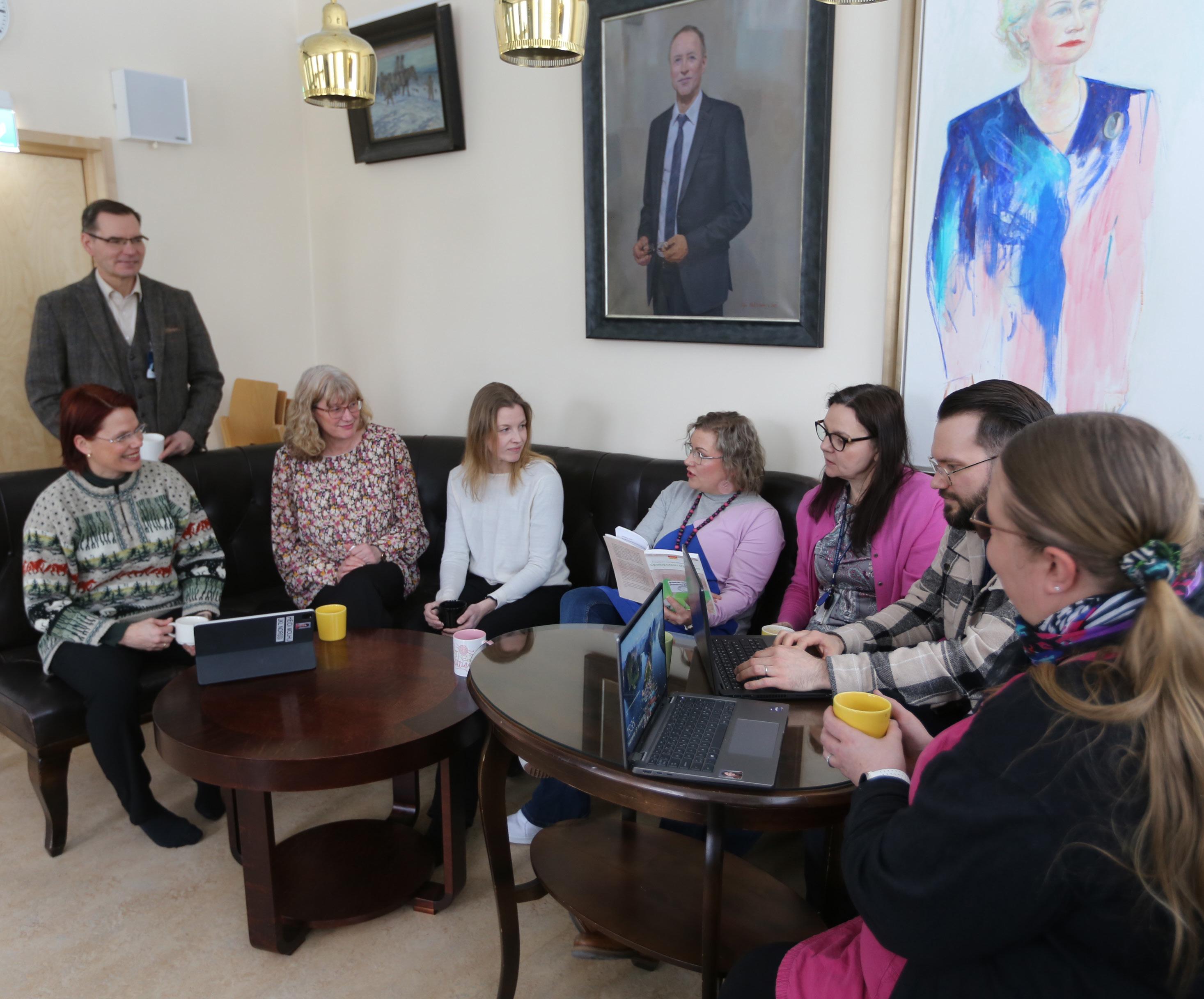 Ohjauskahvilakerrat alkoivat kahvittelulla ja check-inillä eli kuulumiskierroksella, jossa kukin osallistuja sai vapaasti kertoa omia kuulumisiaan ja nostaa esille omasta työstään haluamiaan asioita. Kuulumiskierroksen jälkeen keskusteltiin päivän teemasta. Me ohjauskahvilaa pitäneet ohjaajakouluttajat olimme valmistelleet jokaiselle kerralle alustuksen, joka pidettiin joko keskustelun pohjaksi (esim. ohjauskyselyn tulokset) tai yhteisen keskustelun jatkeeksi (esim. hyvinvointi). Keskustelu oli joka kerralla luontevaa ja pysyi asiassa. Ryhmäkoko oli 7–9, mikä oli sopiva keskusteluun. Toimivuutta lisäsi, kun joka kerralla ei tarvinnut olla sama kokoonpano. Kahvittelukulut pysyivät maltillisina, kun tarjottavat haettiin kaupasta ja kouluttajat laittoivat ne esille ja siivosivat jäljet. Osallistujat kokivat tarjoilut oleellisina, olihan ajankohtana iltapäivä työpäivän jälkeen.