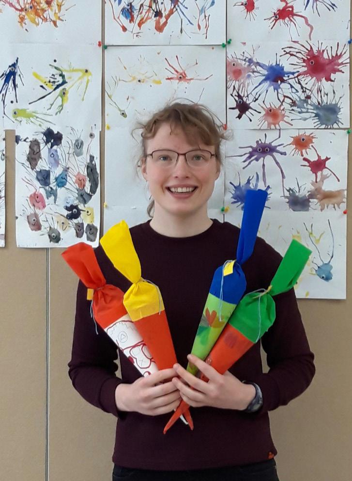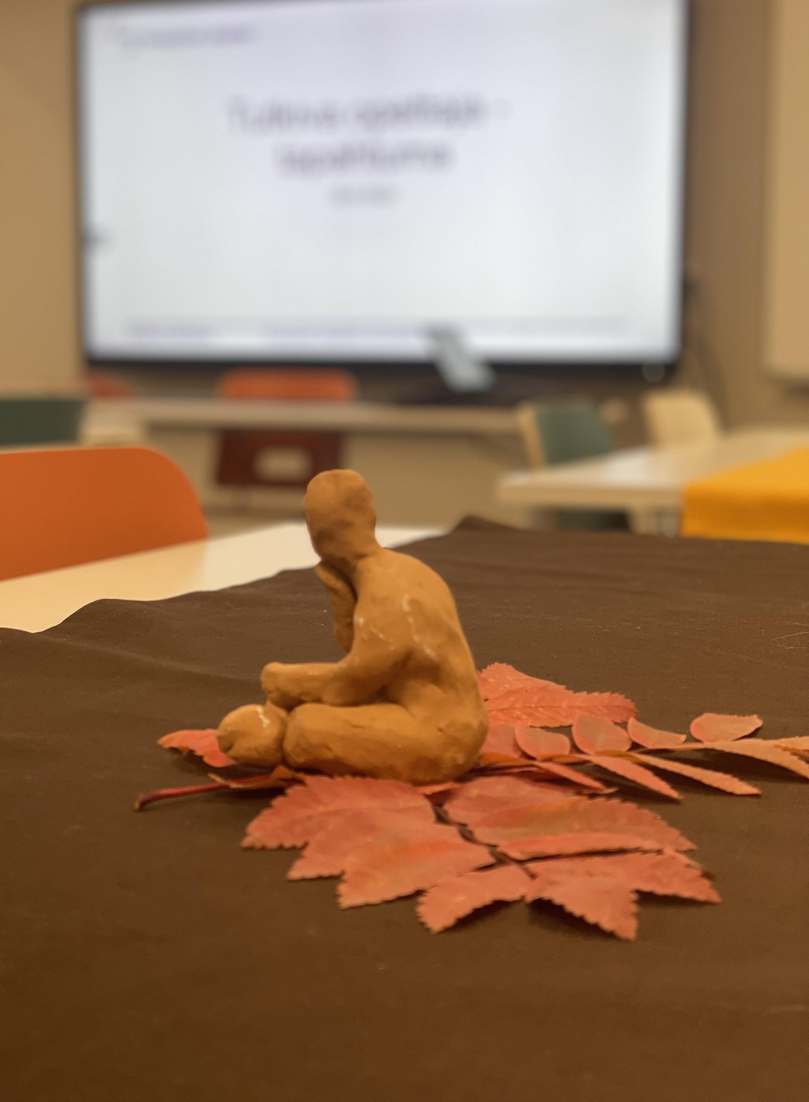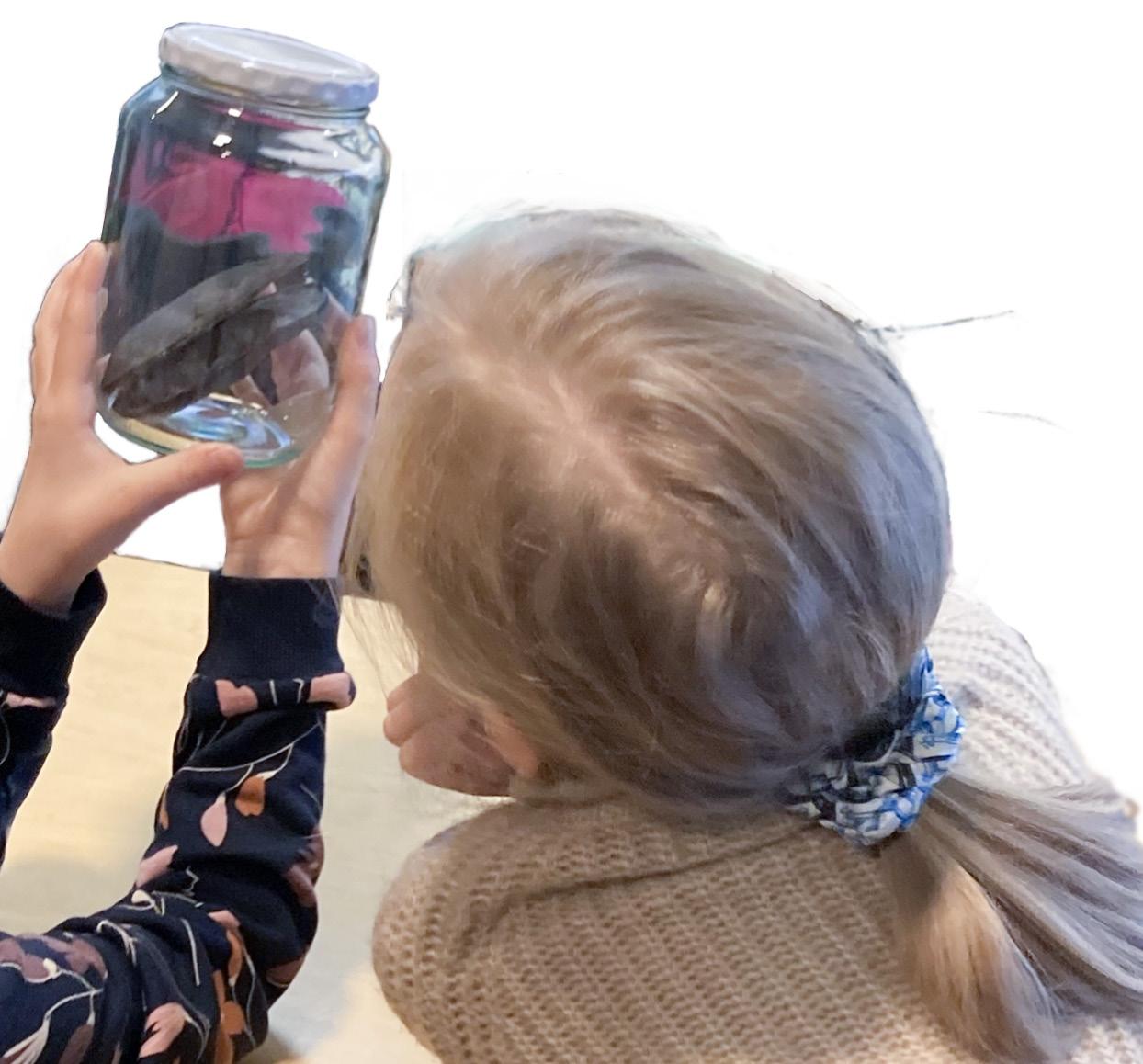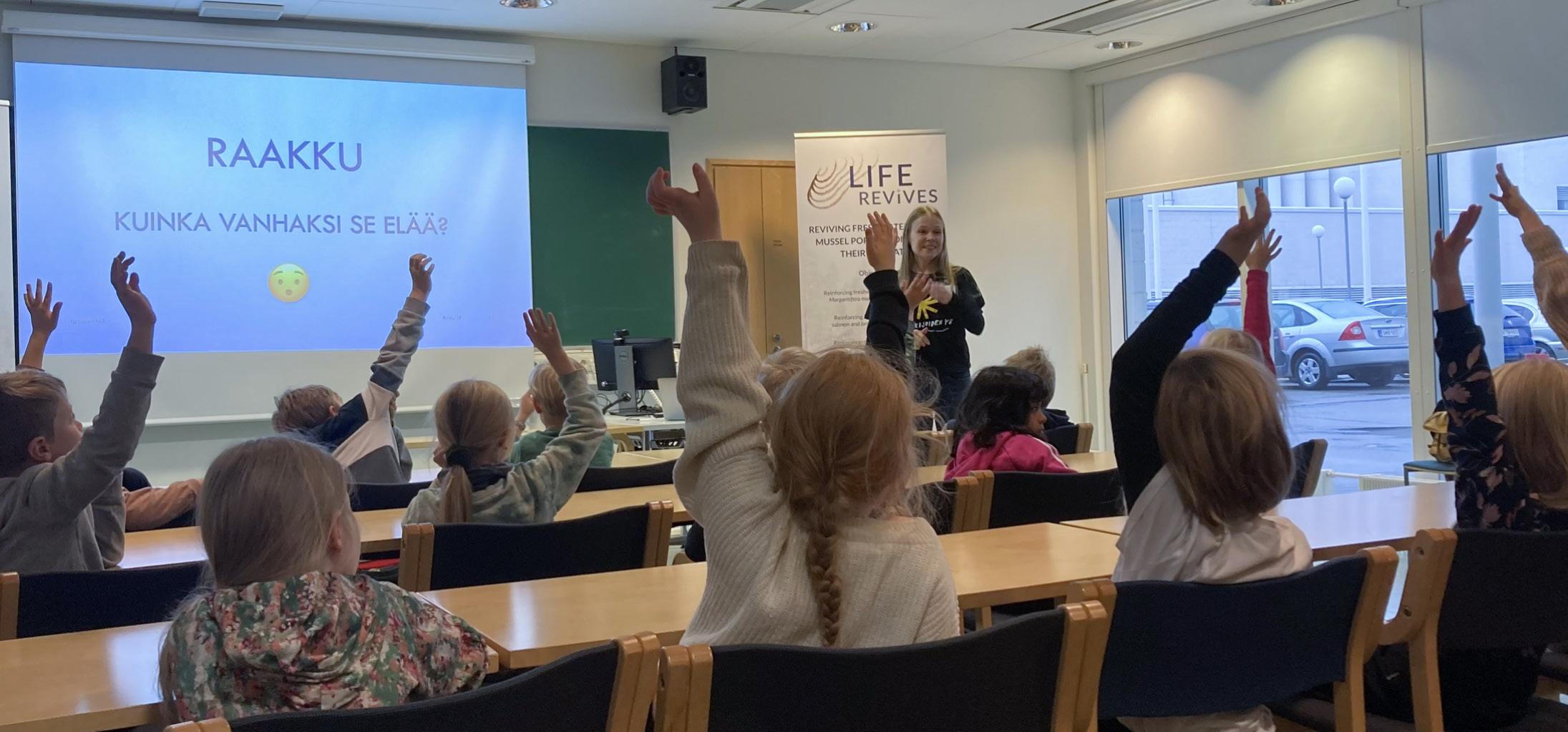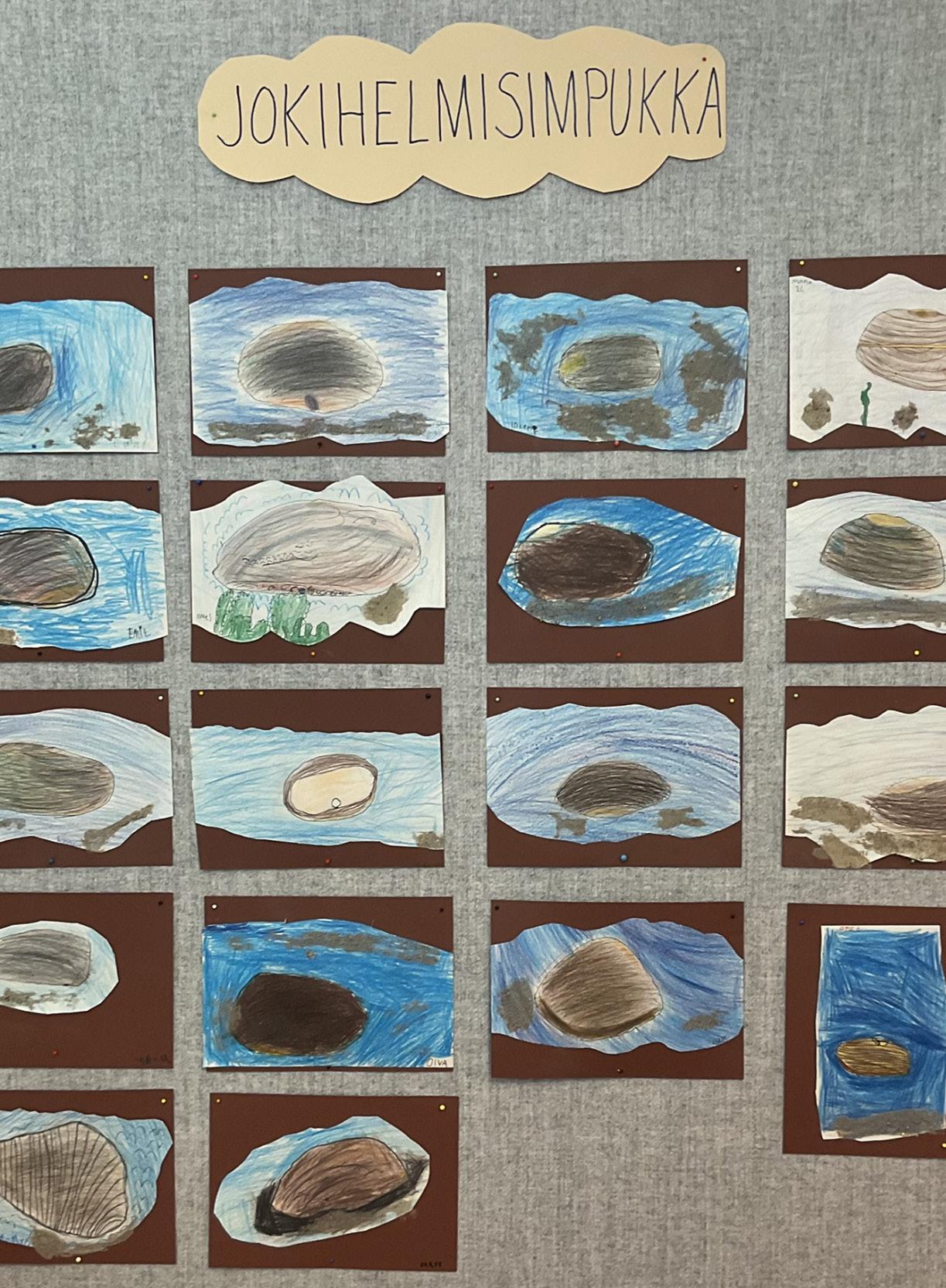 Jyväskylän normaalikoulussa vietettiin seuraava na päivänä Norssin päivää ja avoimia ovia. Luokassa kerroimme huoltajille kuvin ja sanoin jokihelmisimpu kasta muun muassa sen, että tämä rauhoitettu eläin hengittää kiduksilla ja se suodattaa vedestä ravin toa samalla puhdistaen elinympäristöään. Oppilaat osasivat myös kertoa, että raakun toukat tarvitsevat kasvaakseen lohikalan kiduksia kiinnittymällä niihin useammaksi vuodeksi. Samoin muistettiin, että tämä eläin voi elää jopa 200-vuotiaaksi. Oppilaiden ja huol tajien kanssa aloitimme kuvataidetyön, jossa puuvärien eri tummuuseroilla sävytimme joki helmisimpukan pyöreänsoikean muodon. Reunat ja mahdollisen simpukan helmen rajasimme teräväkärkisellä tussilla. Kirkas vetisen joen pohjalle ripottelimme lii maten hiekkaa, ja taustakartongista teimme kehyk set.