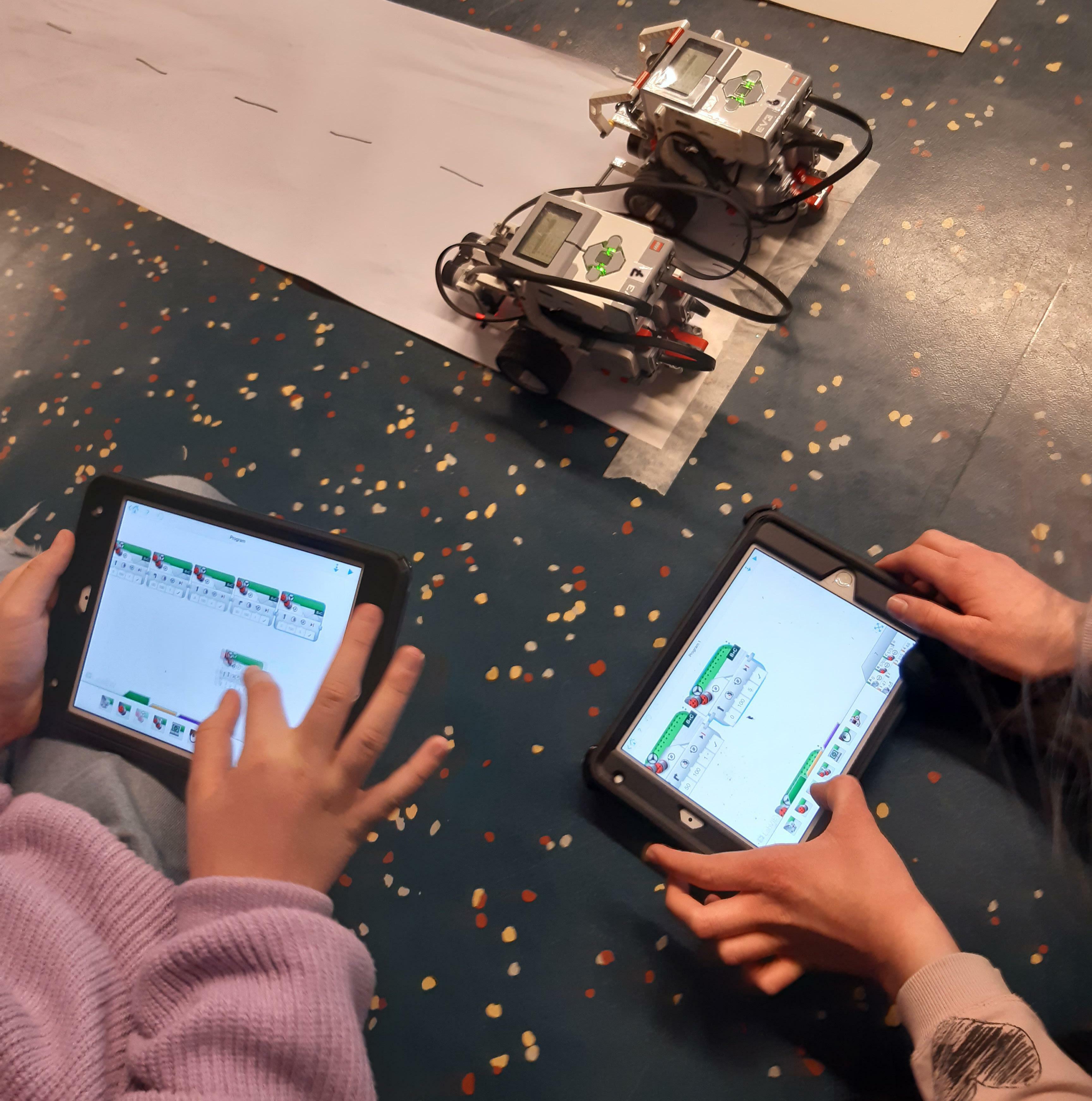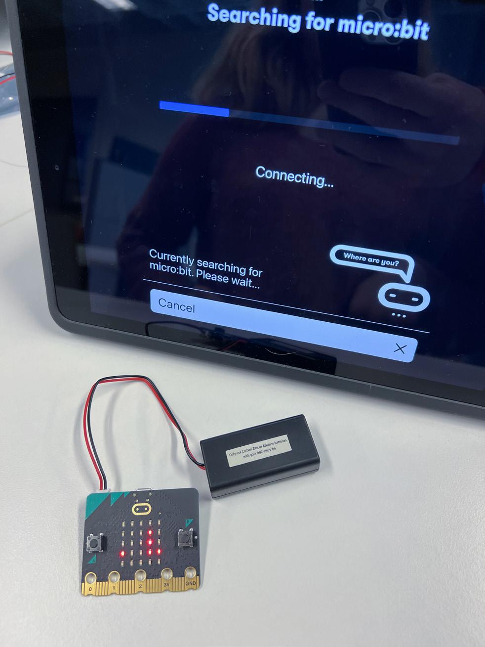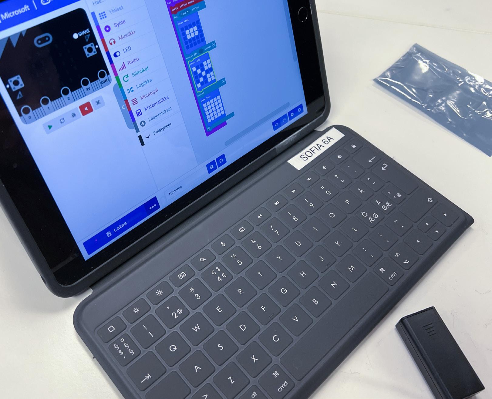 Micro:bit, virtalähde ja iPadin ohjelmointiympäristö.