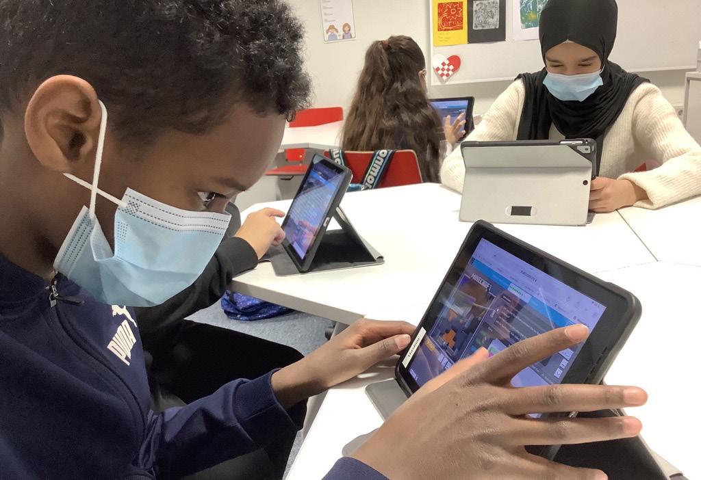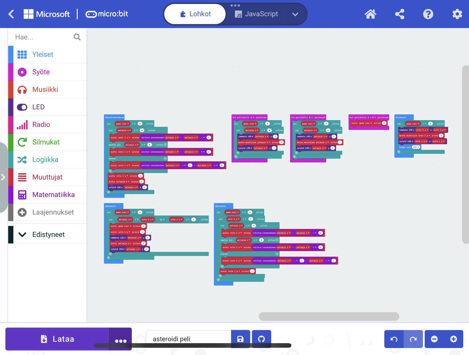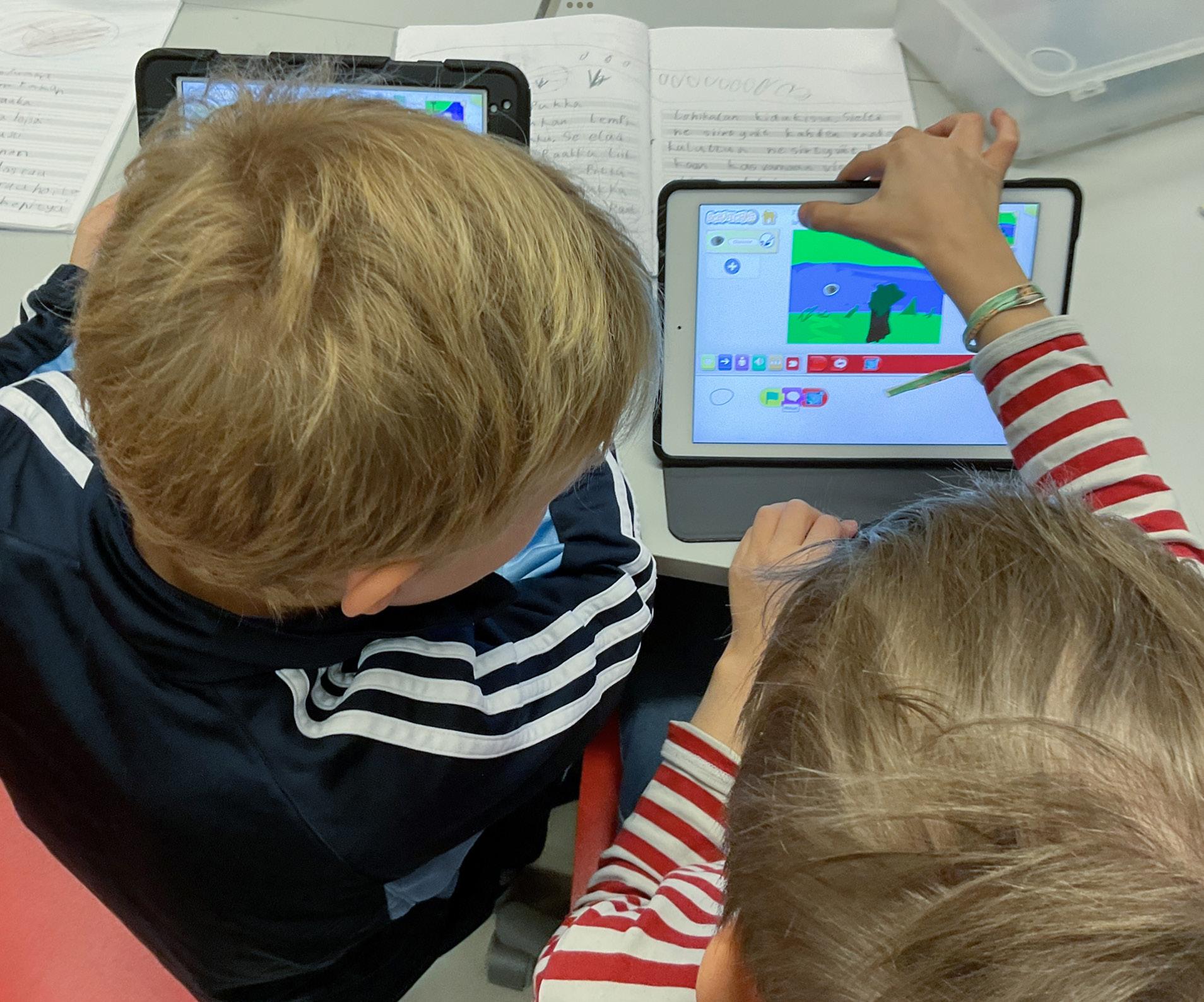 Työskentelyssä lähdettiin liikkeelle sillä, että meillä oli jokin tietty laite tai toiminto, joka pyrittiin itse suunnittelemaan ja koodaamaan. Esimerkkeinä vaikkapa kivi, paperi, sakset -peli, noppa sekä eräänlainen matopeli. Alussa pohdimme yhdessä, millaisia lohko-ohjel moinnin komentoja ehkä tarvitsisimme. Tästä edettiin hyvin nopeasti omaehtoiseen yrittämiseen ja erehtymiseen ja kaverin kanssa yhdessä pohtimiseen. Osa oppilaista pystyi tämän pohjustuksen jälkeen jo itse tuottamaan tarvittavan koodin lohko-ohjelmoinnilla, osa taas hyödynsi valmista ohjetta. Työskentely on siis luonteeltaan itsessään eriyttävää ja opettajan rooliksi jäi enemmänkin kannustajan, ohjaavien kysymysten asettajan sekä mahdollistajan rooli. Ohjelmointi ei lopulta ole lainkaan niin pelottavaa, kuin miten se mo nelle alkuvaiheessa näyttäytyy. Oppijan innostuessa kokeilemaan ja tutkimaan, moni asia tulee mukana ta vallaan itsestään.