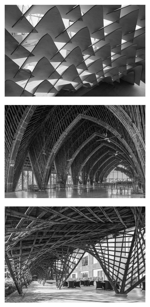 Em buscas feitas por pavilhões e outros centros culturais na Ásia, foi encontrado um material em comum abrangente nesses: o bambu Muito presente na cultura oriental desde a antiguidade, o bambu é conhecido por ser um material forte e flexível, além da sua ampla disponibilidade na natureza Apesar de ainda ser minoria em comparação com edifícios sintéticos de aço e concreto, o bambu possui grande impacto na arquitetura asiática, recuperando a identidade tradicional da região e ajudando em problemas de urbanização - como uma alternativa mais econômica à madeira e com crescimento mais rápido