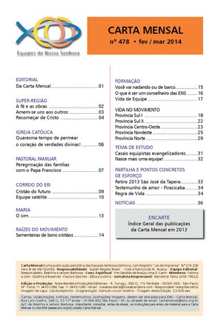 Carta Mensal é uma publicação periódica das Equipes de Nossa Senhora, com Registro “Lei de Imprensa” Nº 219.336 livro B de 09/10/2002. Responsabilidade: Super-Região Brasil - Cida e Raimundo N. Araújo - Equipe Editorial: Responsáveis: Zezinha e Jailson Barbosa - Cons. Espiritual: Frei Geraldo de Araújo Lima O. Carm - Membros: Fatima e Joel - Glasfira e Resende - Paula e Genildo - Zélia e Justino - Jornalista Responsável: Vanderlei Testa (mtb 17622) Edição e Produção: Nova Bandeira Produções Editoriais - R. Turiaçu, 390 Cj. 115 Perdizes - 05005-000 - São Paulo SP - Fone: 11 3473-1286 Fax: 11 3473-1285 - email: novabandeira@novabandeira.com - Responsável: Ivahy Barcellos Imagem de capa: Canstockphoto - Diagramação: Samuel Lincon Silvério - Tiragem desta Edição: 23.000 exs. Cartas, colaborações, notícias, testemunhos, ilustrações/ imagens, devem ser enviadas para ENS - Carta Mensal, Rua Luís Coelho, 308 Cj. 53 11º andar - 01309-902 São Paulo - SP, ou através de email: cartamensal@ens.org.br A/C de Zezinha e Jailson Barbosa. Importante: consultar, antes de enviar, as instruções para envio de material para a Carta Mensal no site ENS (www.ens.org.br) acesso Carta Mensal.
