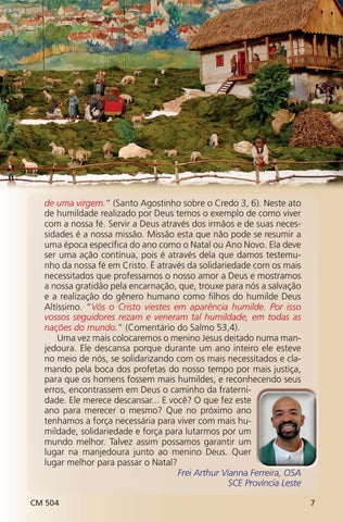 de uma virgem.” (Santo Agostinho sobre o Credo 3, 6). Neste ato de humildade realizado por Deus temos o exemplo de como viver com a nossa fé. Servir a Deus através dos irmãos e de suas necessidades é a nossa missão. Missão esta que não pode se resumir a uma época específica do ano como o Natal ou Ano Novo. Ela deve ser uma ação contínua, pois é através dela que damos testemunho da nossa fé em Cristo. É através da solidariedade com os mais necessitados que professamos o nosso amor a Deus e mostramos a nossa gratidão pela encarnação, que, trouxe para nós a salvação e a realização do gênero humano como filhos do humilde Deus Altíssimo. “Vós o Cristo viestes em aparência humilde. Por isso vossos seguidores rezam e veneram tal humildade, em todas as nações do mundo.” (Comentário do Salmo 53,4). Uma vez mais colocaremos o menino Jesus deitado numa manjedoura. Ele descansa porque durante um ano inteiro ele esteve no meio de nós, se solidarizando com os mais necessitados e clamando pela boca dos profetas do nosso tempo por mais justiça, para que os homens fossem mais humildes, e reconhecendo seus erros, encontrassem em Deus o caminho da fraternidade. Ele merece descansar... E você? O que fez este ano para merecer o mesmo? Que no próximo ano tenhamos a força necessária para viver com mais humildade, solidariedade e força para lutarmos por um mundo melhor. Talvez assim possamos garantir um lugar na manjedoura junto ao menino Deus. Quer lugar melhor para passar o Natal? Frei Arthur Vianna Ferreira, OSA SCE Província Leste CM 504