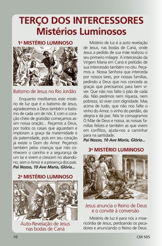 Batismo de Jesus no Rio Jordão Enquanto meditamos este mistério de luz que é o batismo de Jesus, agradecemos a Deus também o batismo de cada um de nós. E com o coração cheio de gratidão começamos assim nossa oração... Peçamos a Deus, por todos os casais que aguardam e imploram a graça da maternidade e da paternidade, pois em seu coração já existe o Dom do Amor. Peçamos também pelas crianças que não conhecem o carinho e a segurança de um lar e vivem e crescem no abandono, sem o Amor e a presença dos pais. Pai Nosso, 10 Ave Maria, Glória...