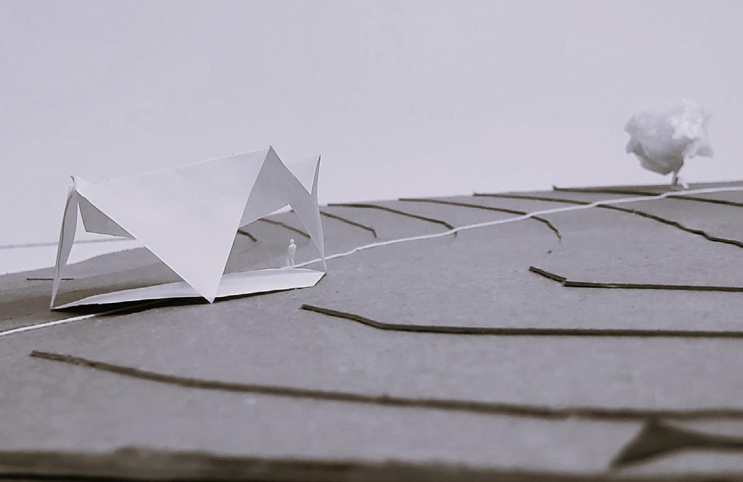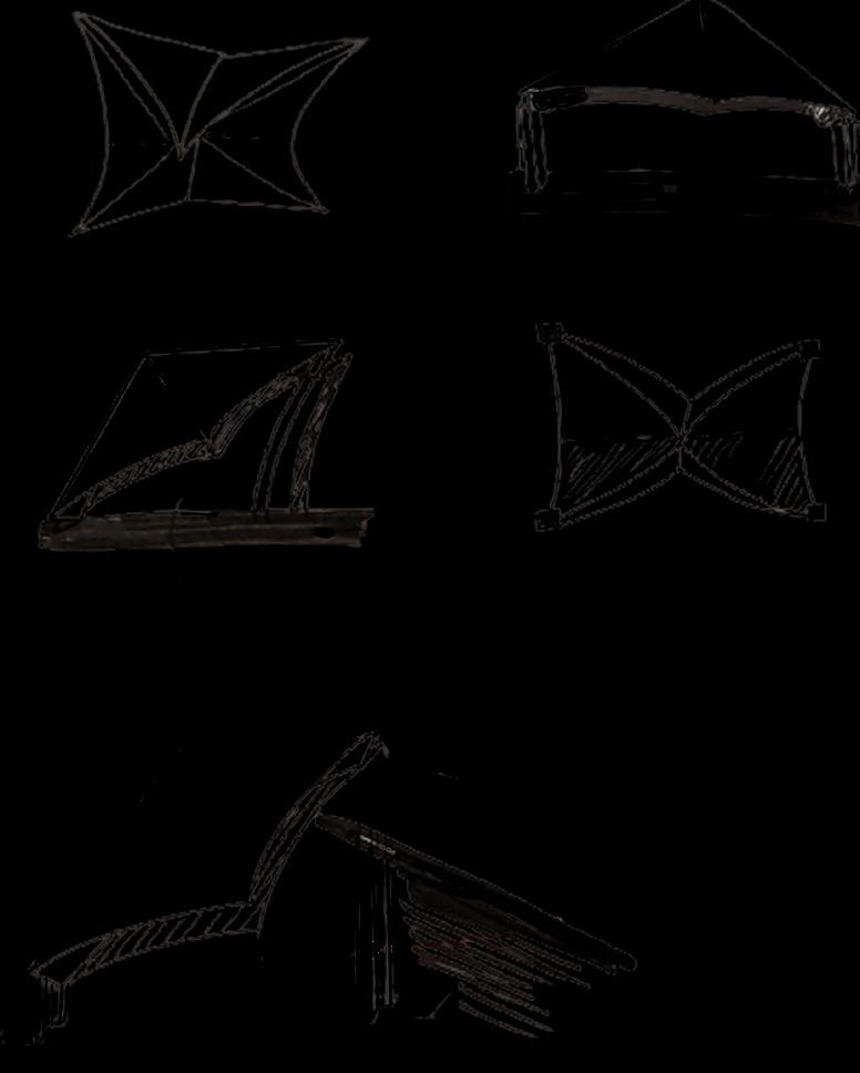 The pavilion was developed from the idea of being cupped by the land. The roof form was created to be a more geometric representation of a cup-like shape. The roof was designed to catch and redirect water. The final design redirected water to the center of the roof and into a vessel at the center of the pavilion’s platform.